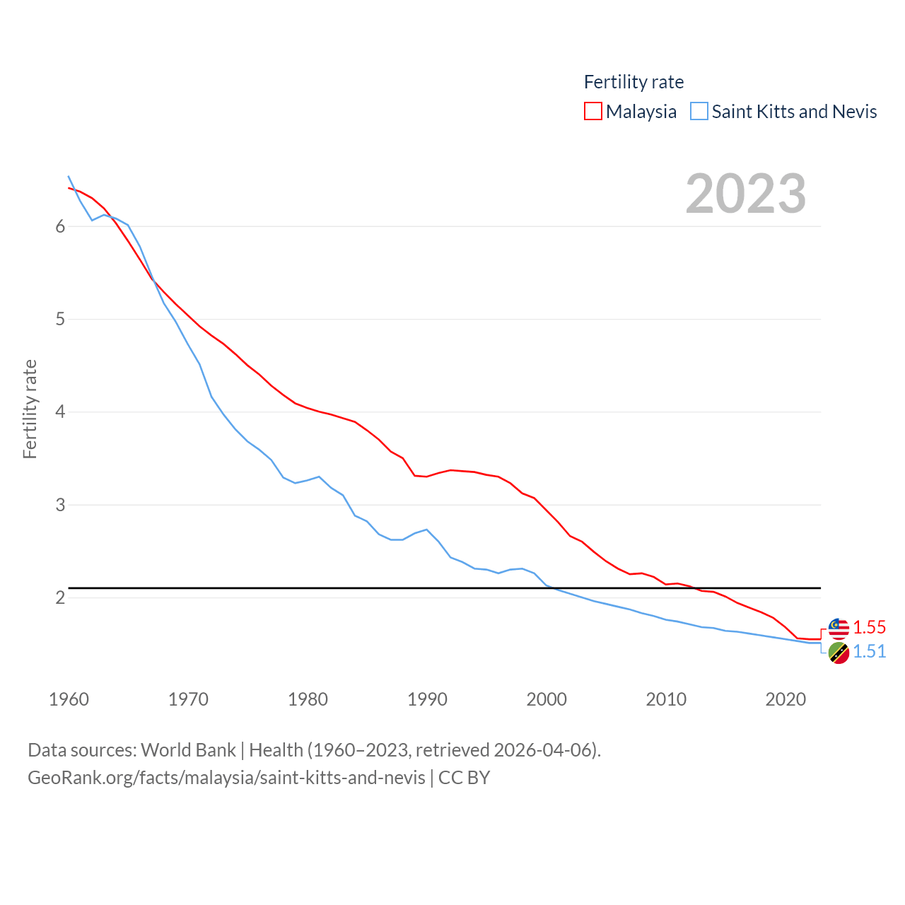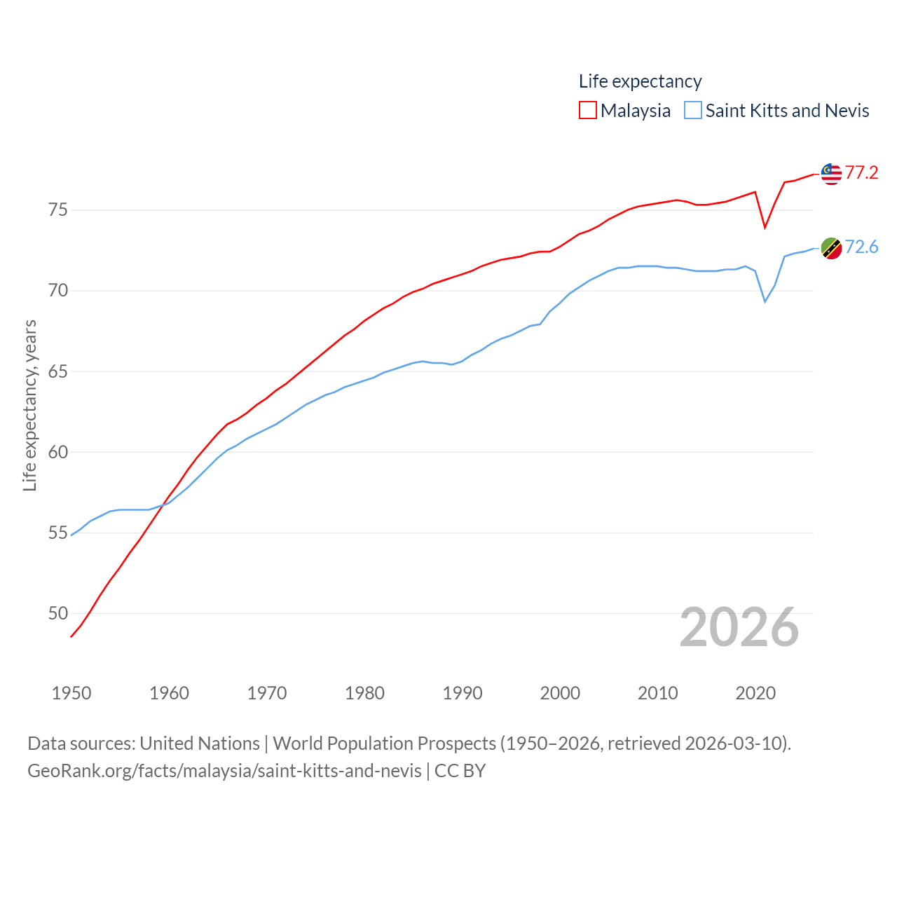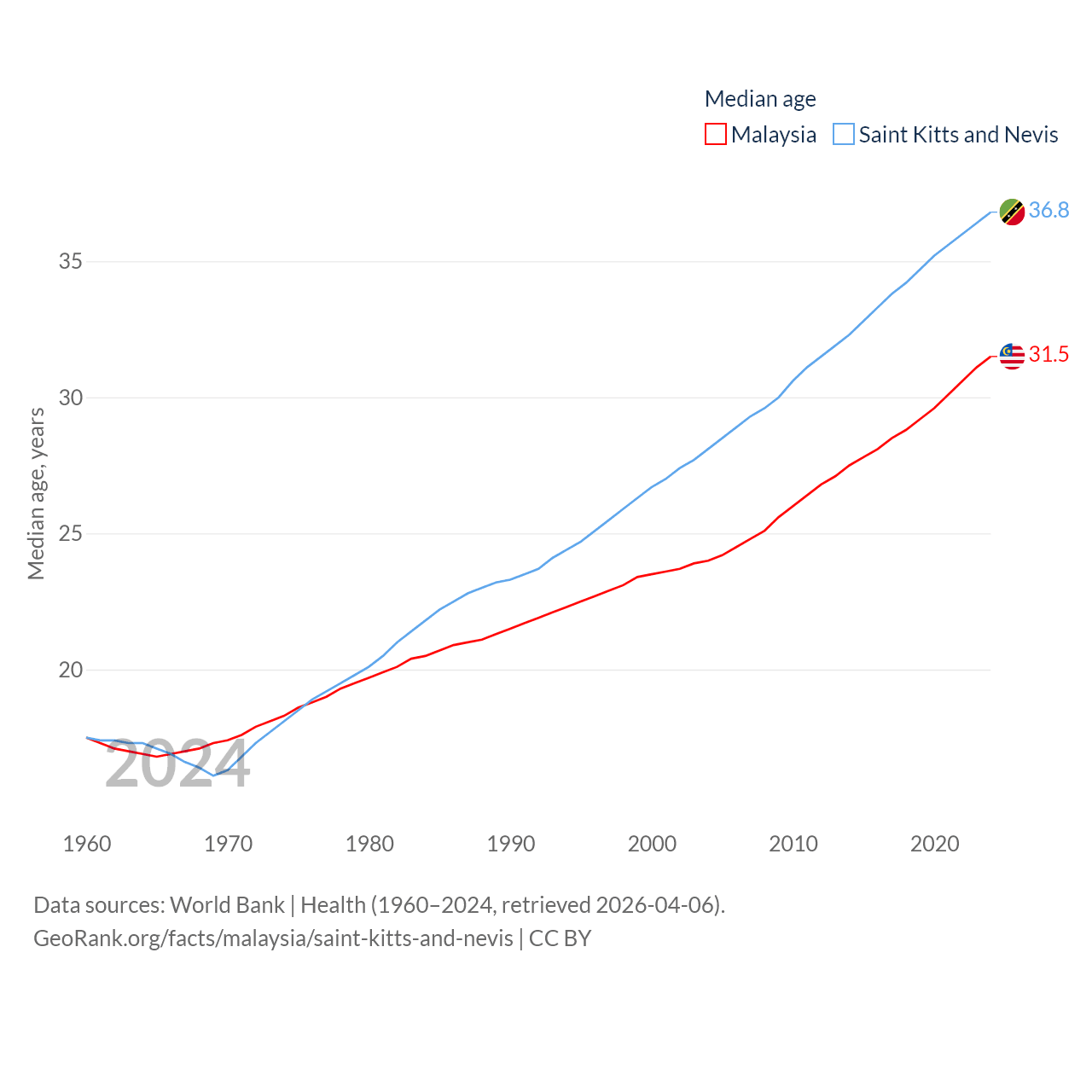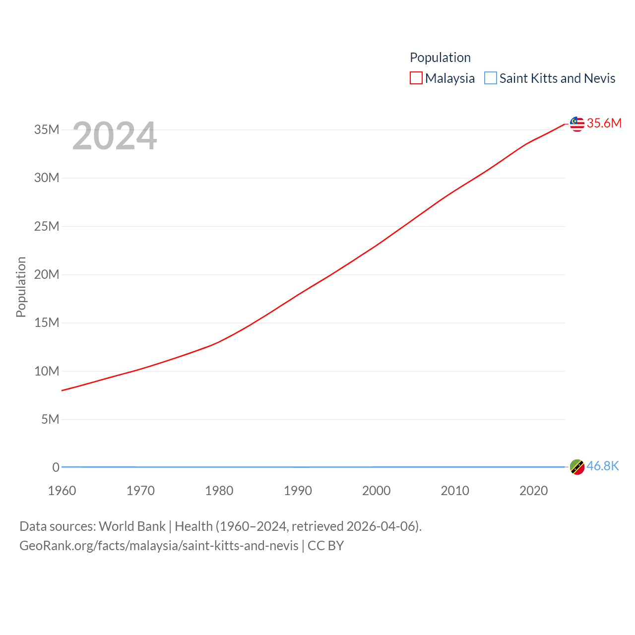 Malaysia has a population of 35.6M (ranked 44/197), compared with 46.8K in Saint Kitts and Nevis (ranked 189/197). Malaysia's land area is 126,854 sq mi versus 100.4 sq mi for Saint Kitts and Nevis (ranked 65th vs. 189th).