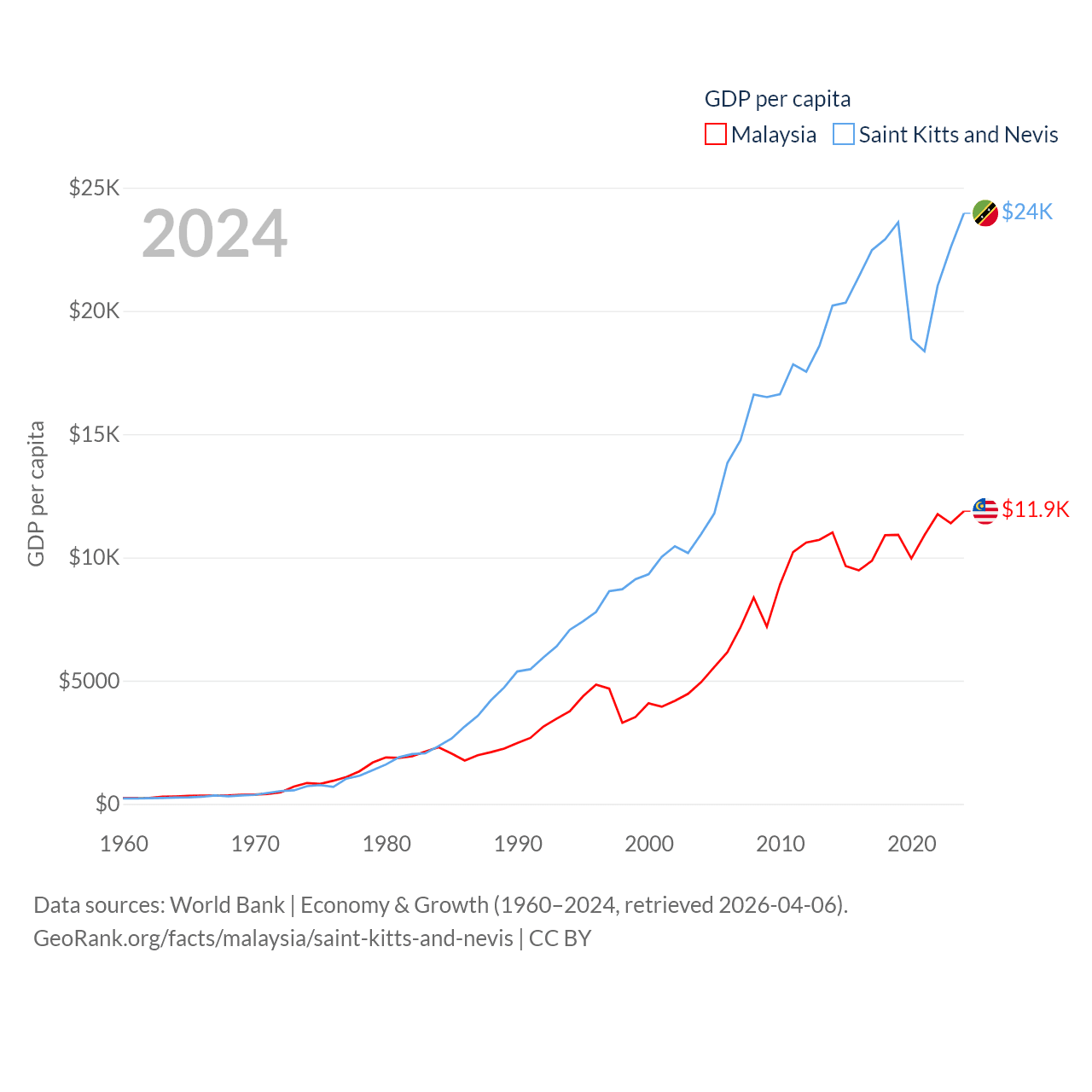 By GDP, Malaysia ranks 38/197 ($422B) and Saint Kitts and Nevis ranks 187/197 ($1.12B). By GDP per capita, Malaysia ranks 79/197 ($11,874), while Saint Kitts and Nevis ranks 51/197 ($23,961).