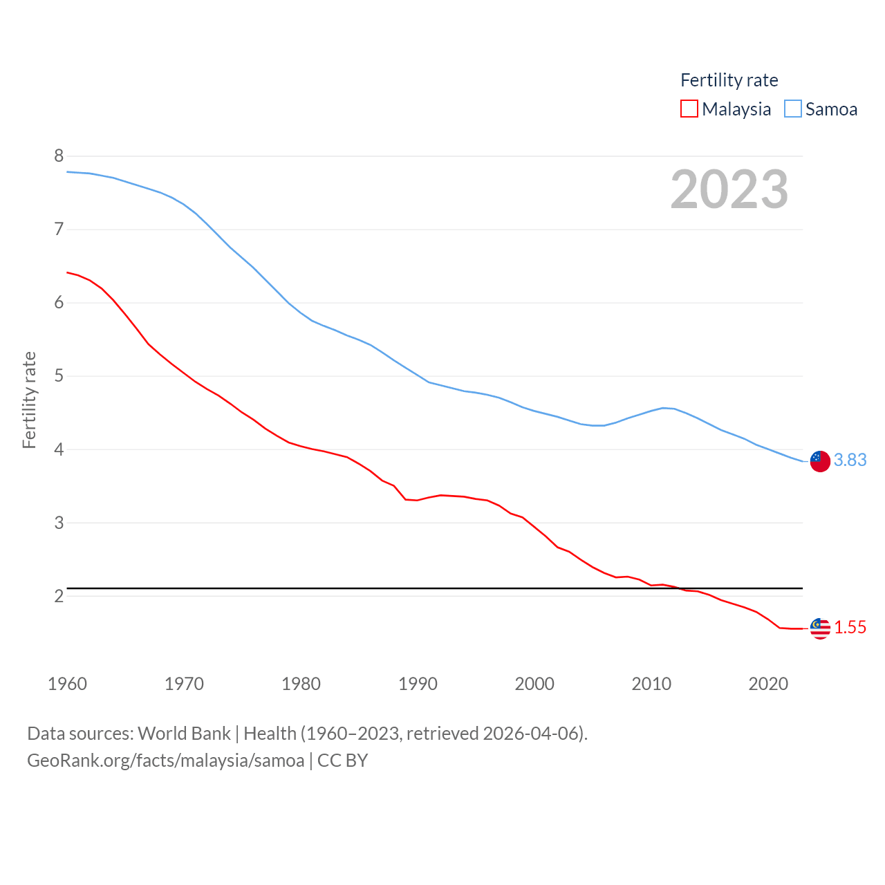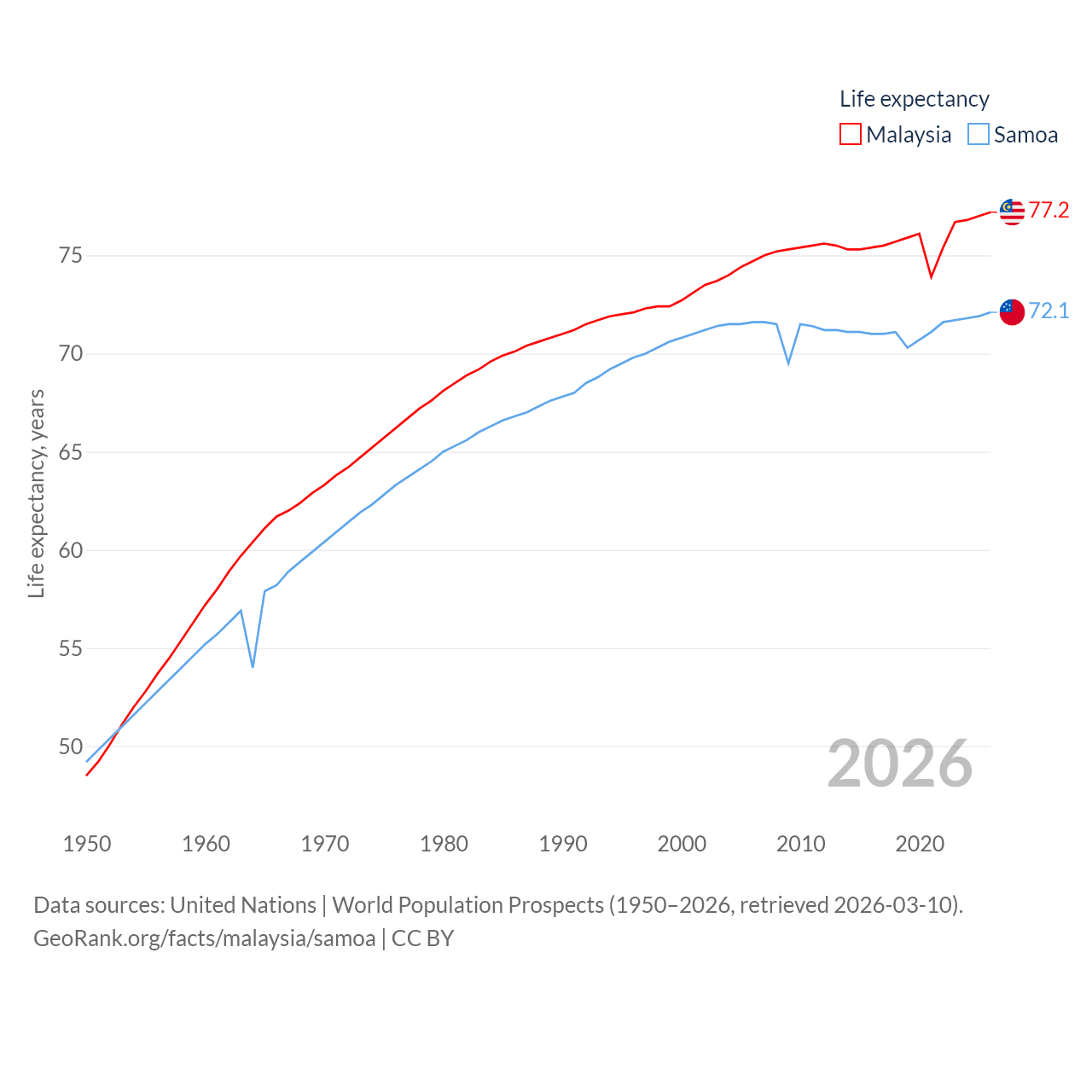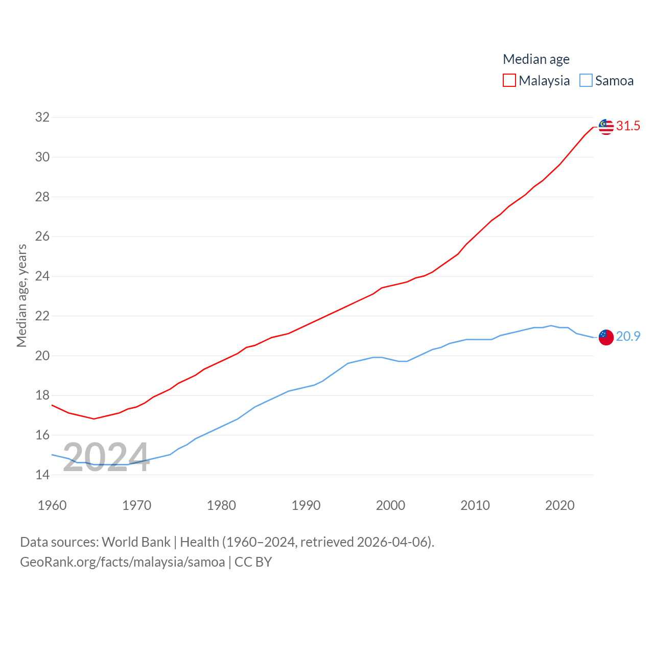 Malaysia has a population of 35.6M (ranked 44/197), compared with 218K in Samoa (ranked 177/197). Malaysia's land area is 126,854 sq mi versus 1,073 sq mi for Samoa (ranked 65th vs. 168th).