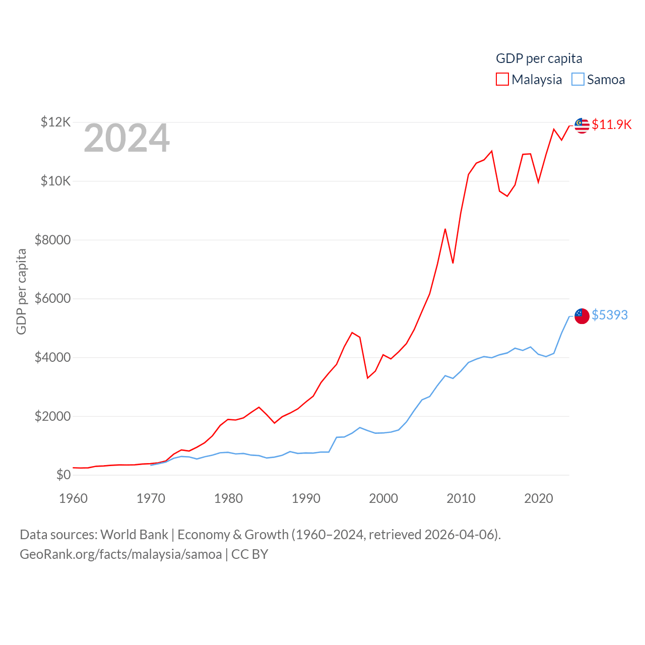 By GDP, Malaysia ranks 38/197 ($422B) and Samoa ranks 185/197 ($1.18B). By GDP per capita, Malaysia ranks 79/197 ($11,874), while Samoa ranks 117/197 ($5,393).