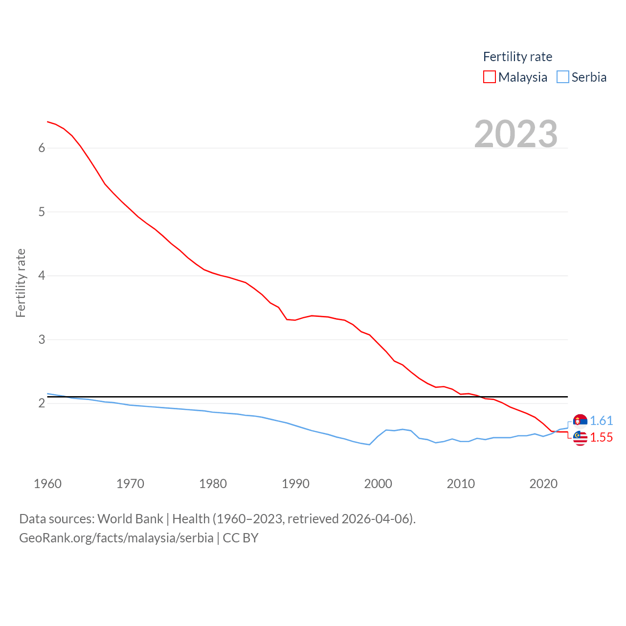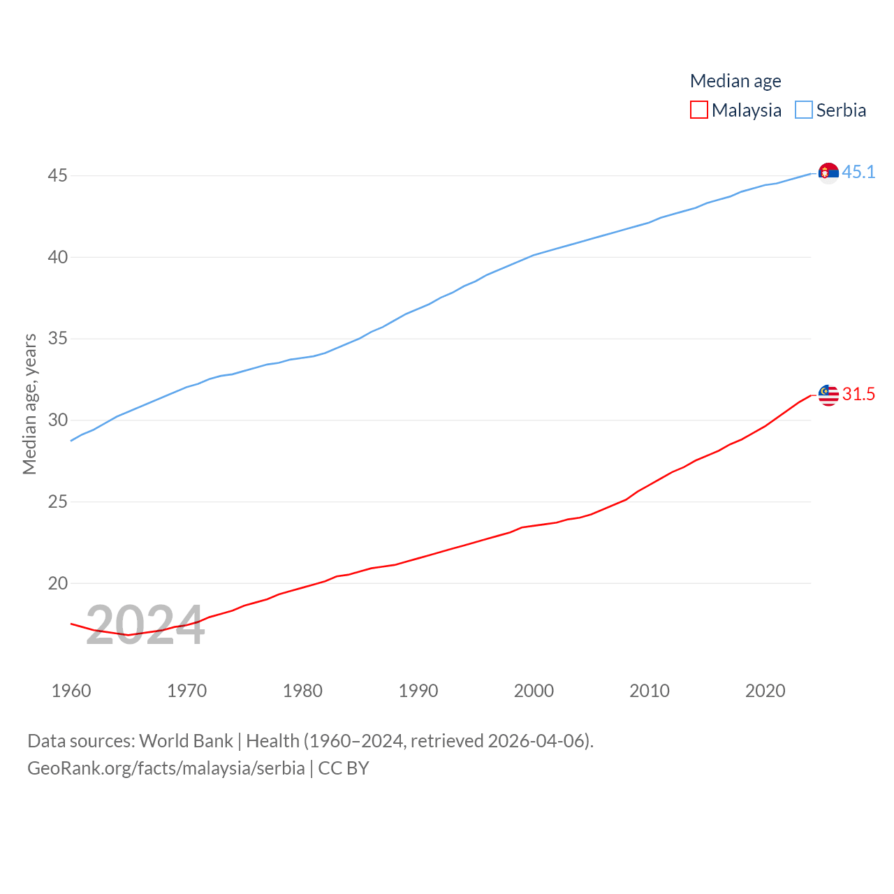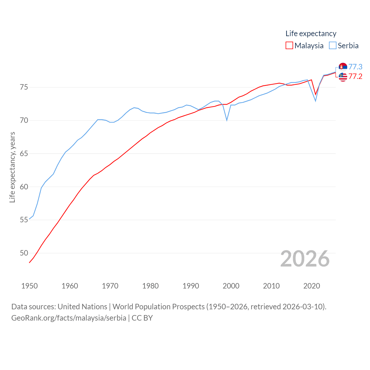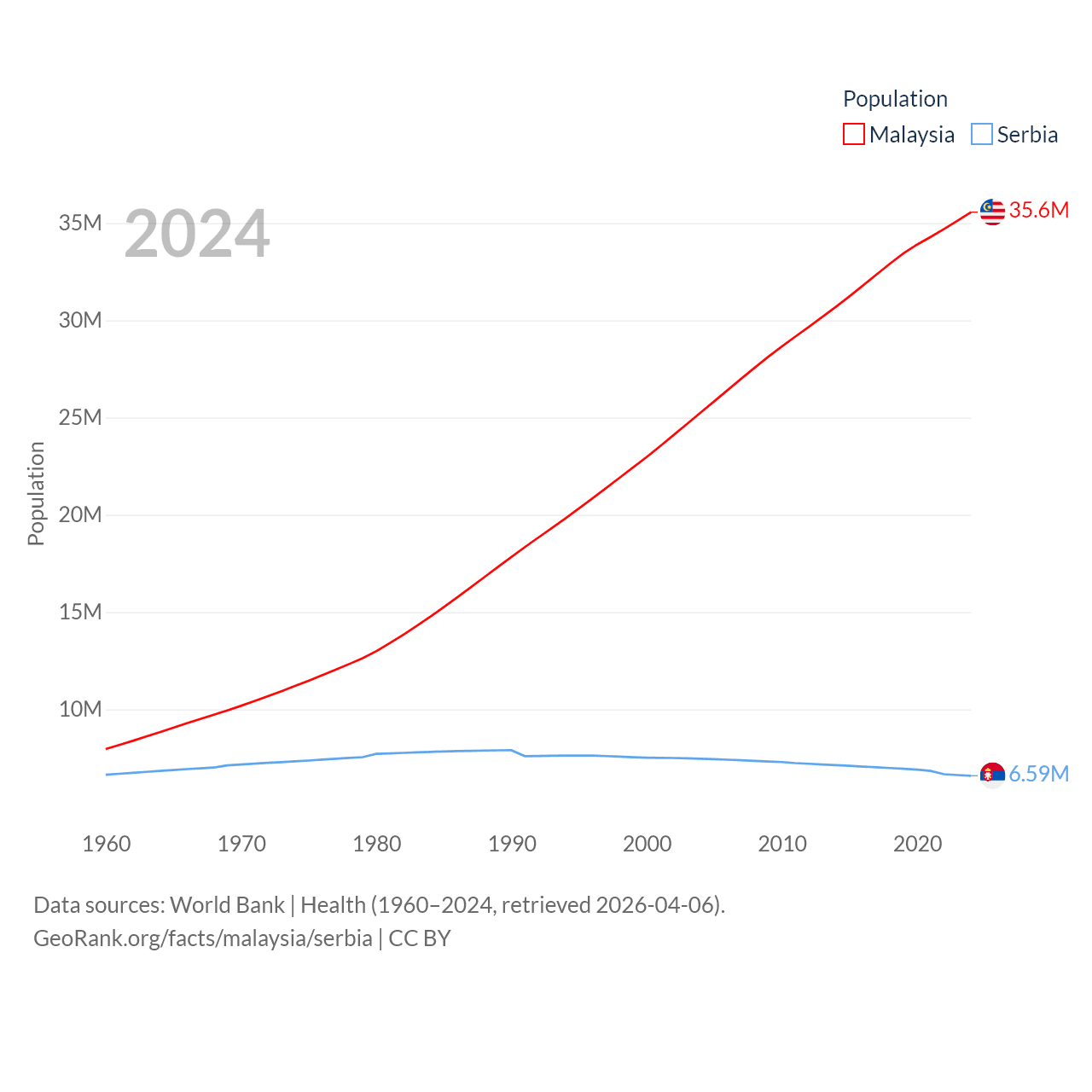 Malaysia has a population of 35.6M (ranked 44/197), compared with 6.59M in Serbia (ranked 109/197). Malaysia's land area is 126,854 sq mi versus 32,467 sq mi for Serbia (ranked 65th vs. 111th).