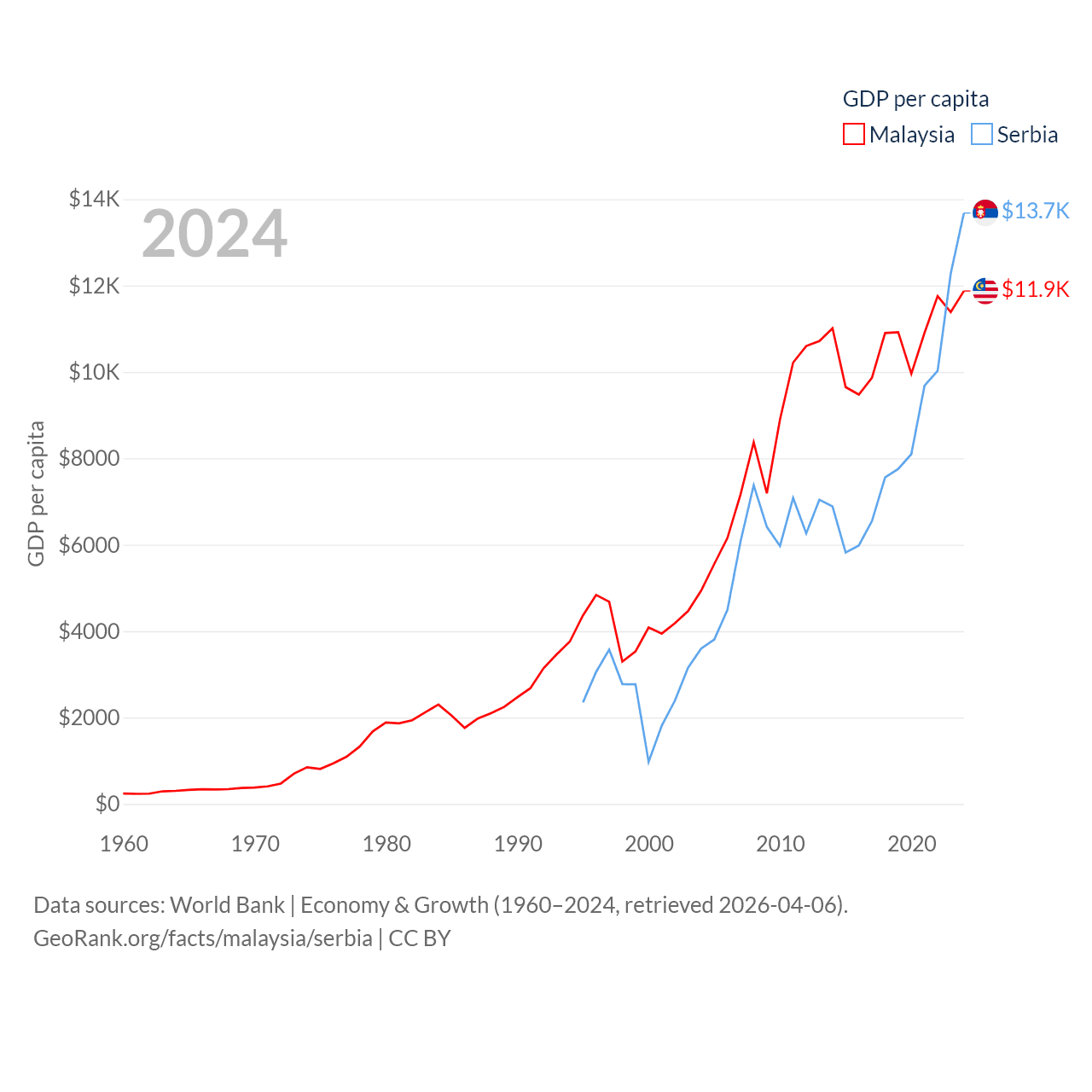 By GDP, Malaysia ranks 38/197 ($422B) and Serbia ranks 76/197 ($90.1B). By GDP per capita, Malaysia ranks 79/197 ($11,874), while Serbia ranks 73/197 ($13,679).