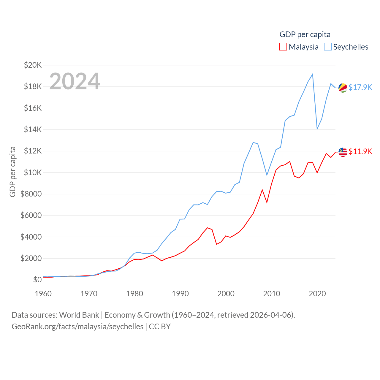 By GDP, Malaysia ranks 38/197 ($422B) and The Seychelles ranks 178/197 ($2.17B). By GDP per capita, Malaysia ranks 79/197 ($11,874), while The Seychelles ranks 63/197 ($17,859).