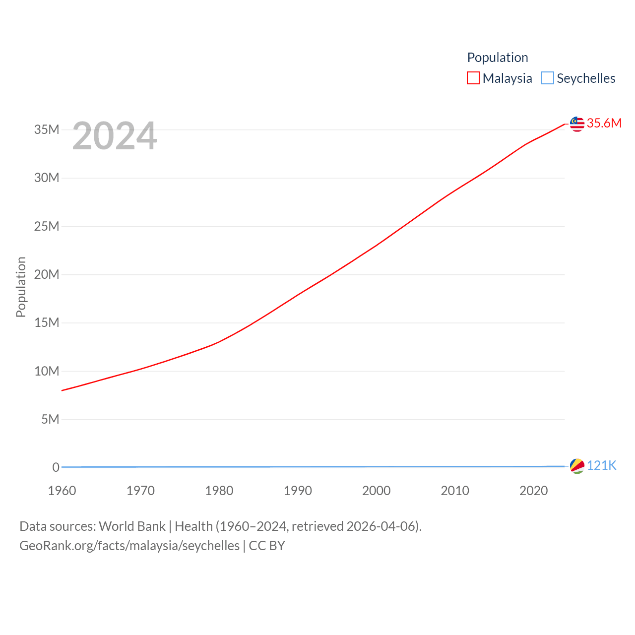 Malaysia has a population of 35.6M (ranked 44/197), compared with 121K in The Seychelles (ranked 181/197). Malaysia's land area is 126,854 sq mi versus 177.6 sq mi for The Seychelles (ranked 65th vs. 181st).