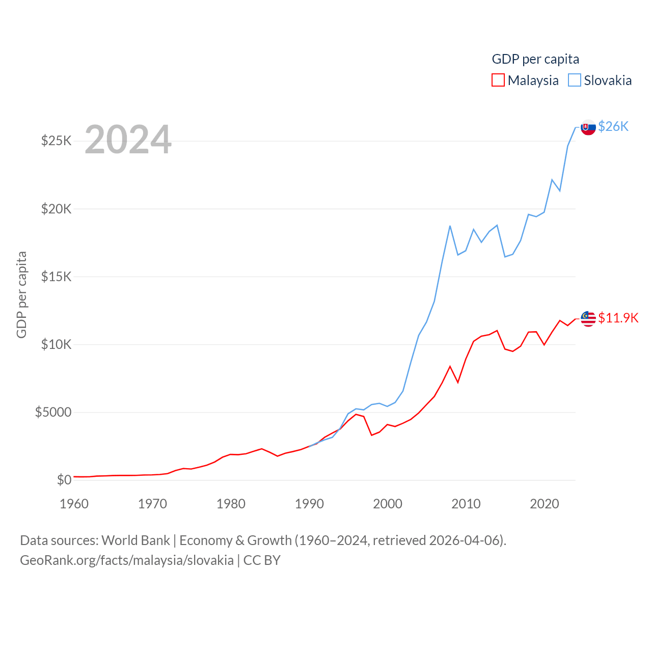By GDP, Malaysia ranks 38/197 ($422B) and Slovakia ranks 61/197 ($141B). By GDP per capita, Malaysia ranks 79/197 ($11,874), while Slovakia ranks 47/197 ($25,993).