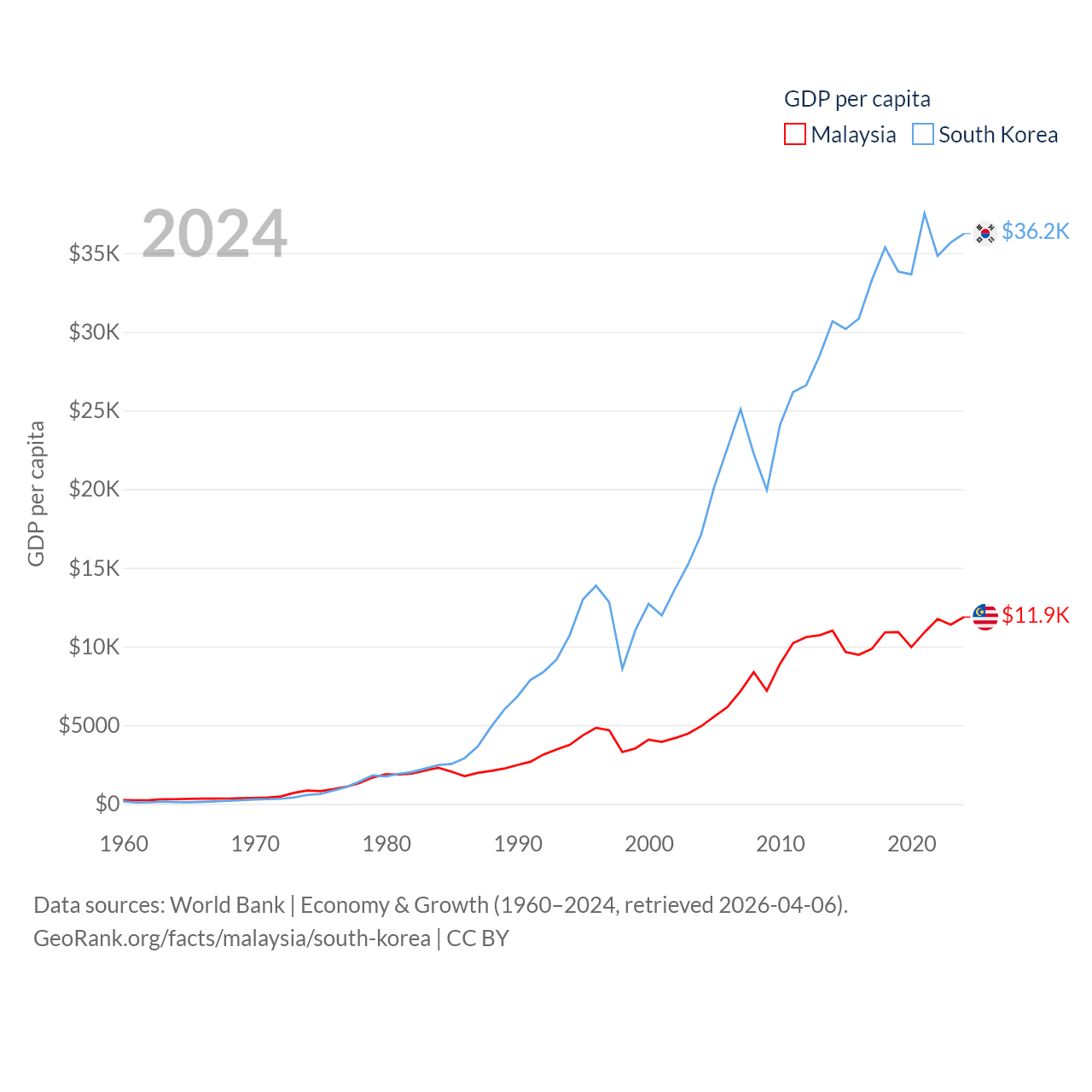 By GDP, Malaysia ranks 38/197 ($422B) and South Korea ranks 12/197 ($1.88T). By GDP per capita, Malaysia ranks 79/197 ($11,874), while South Korea ranks 31/197 ($36,239).