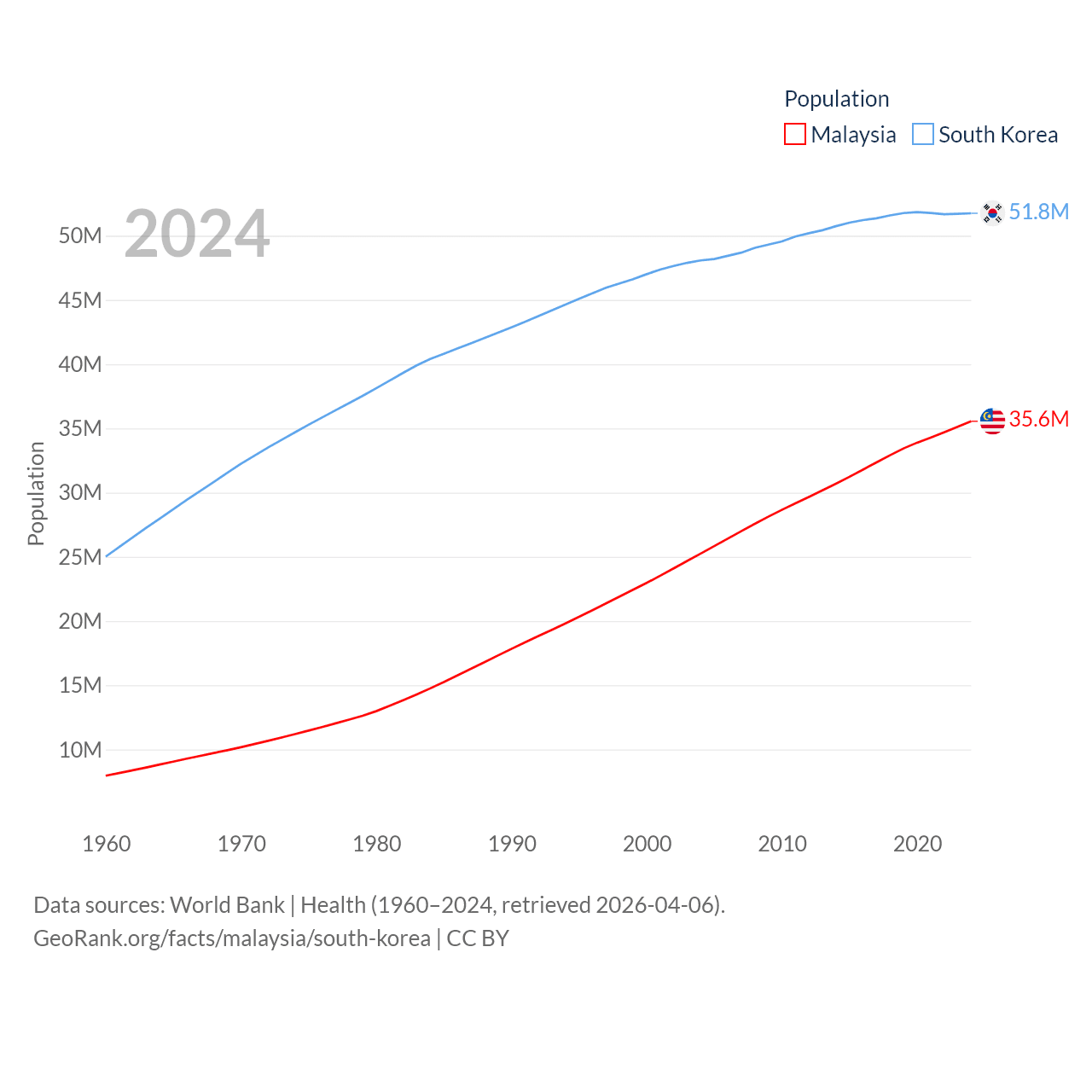 Malaysia has a population of 35.6M (ranked 44/197), compared with 51.8M in South Korea (ranked 29/197). Malaysia's land area is 126,854 sq mi versus 37,684 sq mi for South Korea (ranked 65th vs. 105th).