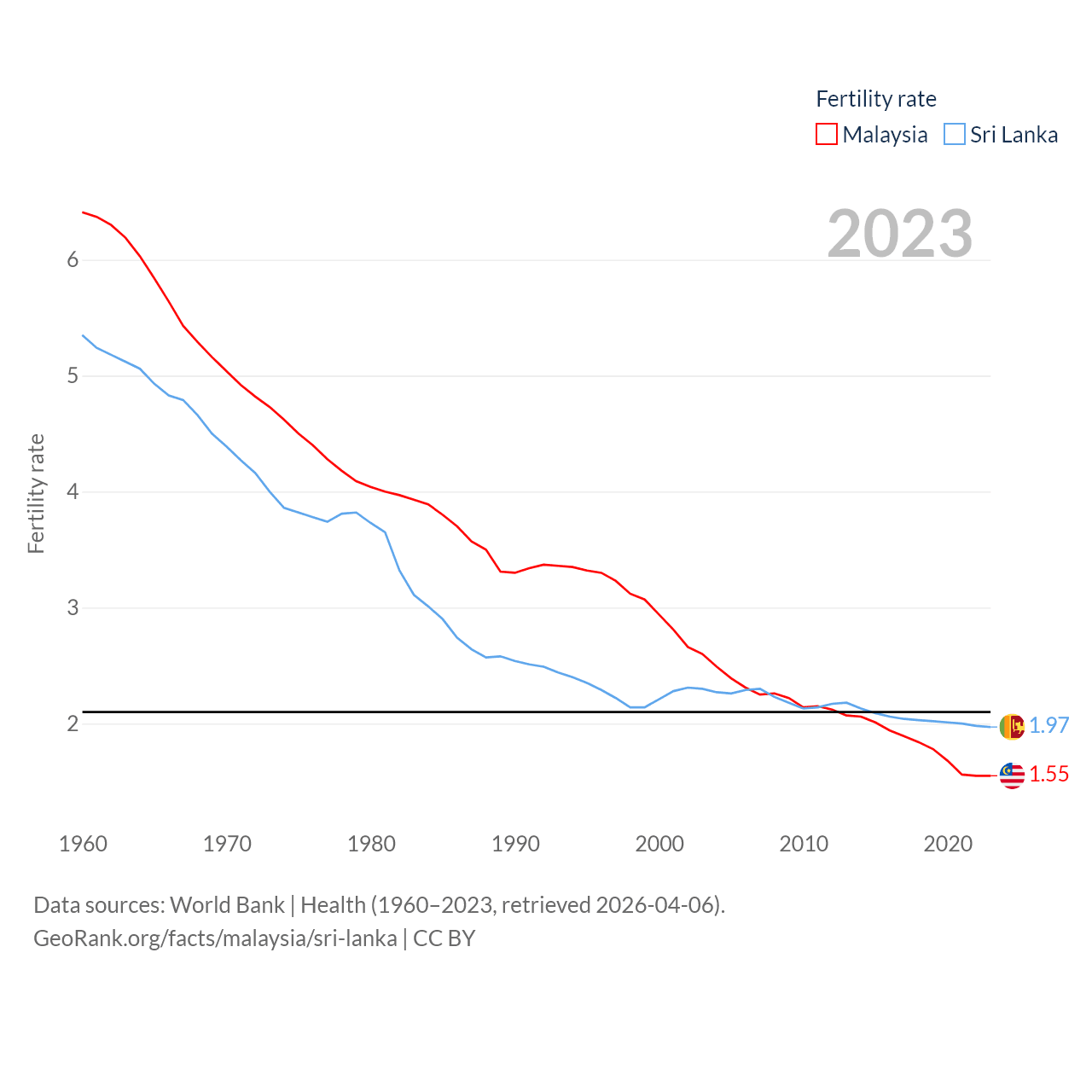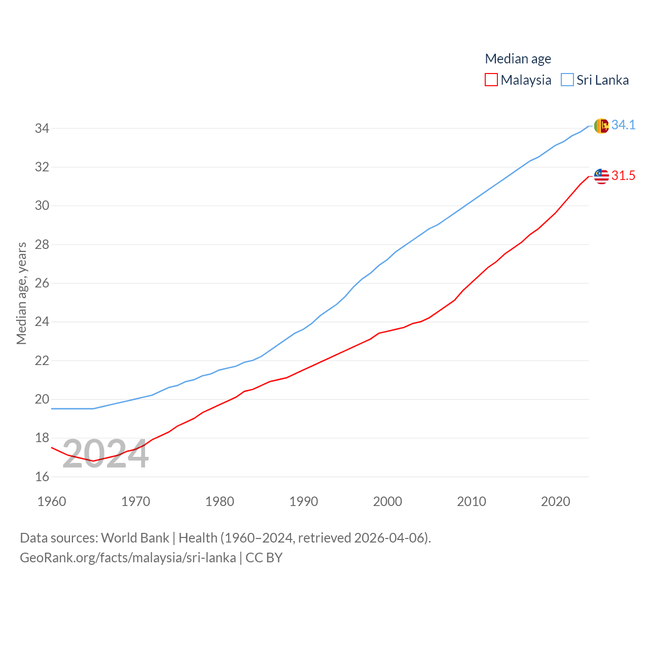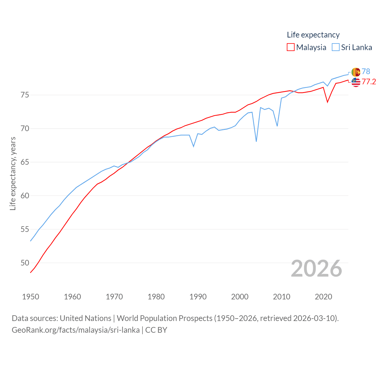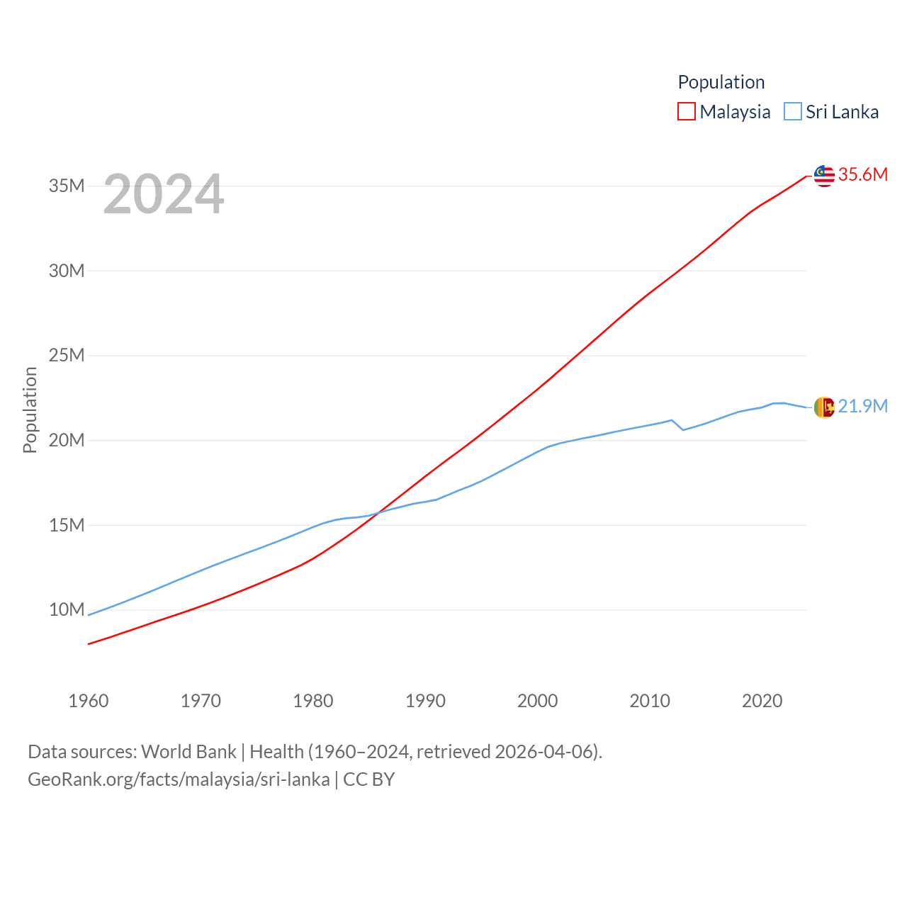 Malaysia has a population of 35.6M (ranked 44/197), compared with 21.9M in Sri Lanka (ranked 61/197). Malaysia's land area is 126,854 sq mi versus 23,884 sq mi for Sri Lanka (ranked 65th vs. 122nd).