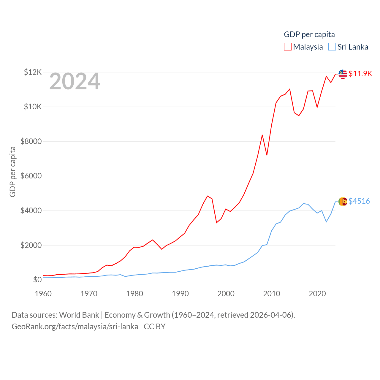 By GDP, Malaysia ranks 38/197 ($422B) and Sri Lanka ranks 72/197 ($99B). By GDP per capita, Malaysia ranks 79/197 ($11,874), while Sri Lanka ranks 124/197 ($4,516).