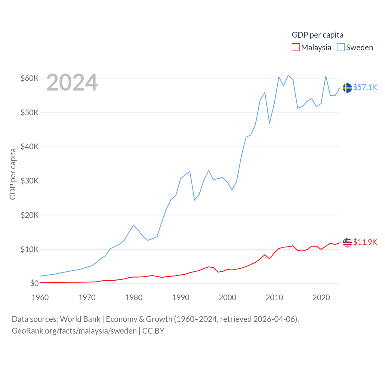 By GDP, Malaysia ranks 38/197 ($422B) and Sweden ranks 26/197 ($604B). By GDP per capita, Malaysia ranks 79/197 ($11,874), while Sweden ranks 17/197 ($57,117).