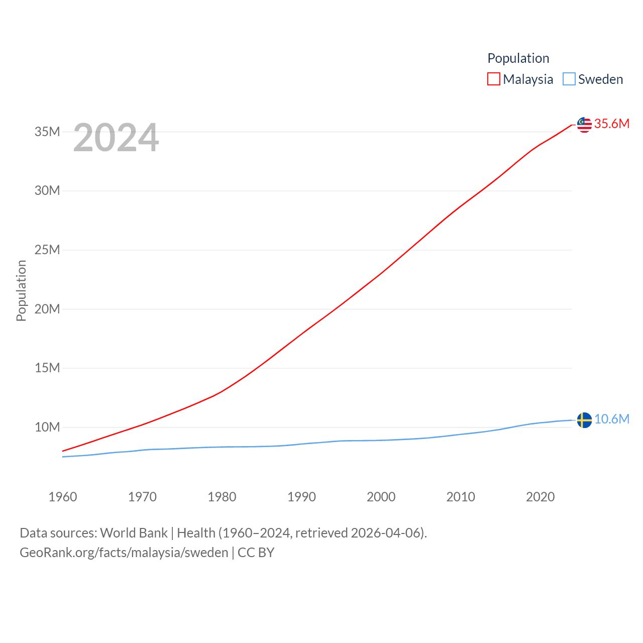 Malaysia has a population of 35.6M (ranked 44/197), compared with 10.6M in Sweden (ranked 93/197). Malaysia's land area is 126,854 sq mi versus 157,248 sq mi for Sweden (ranked 65th vs. 58th).