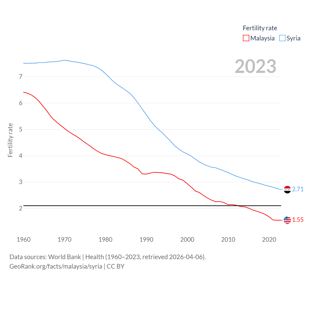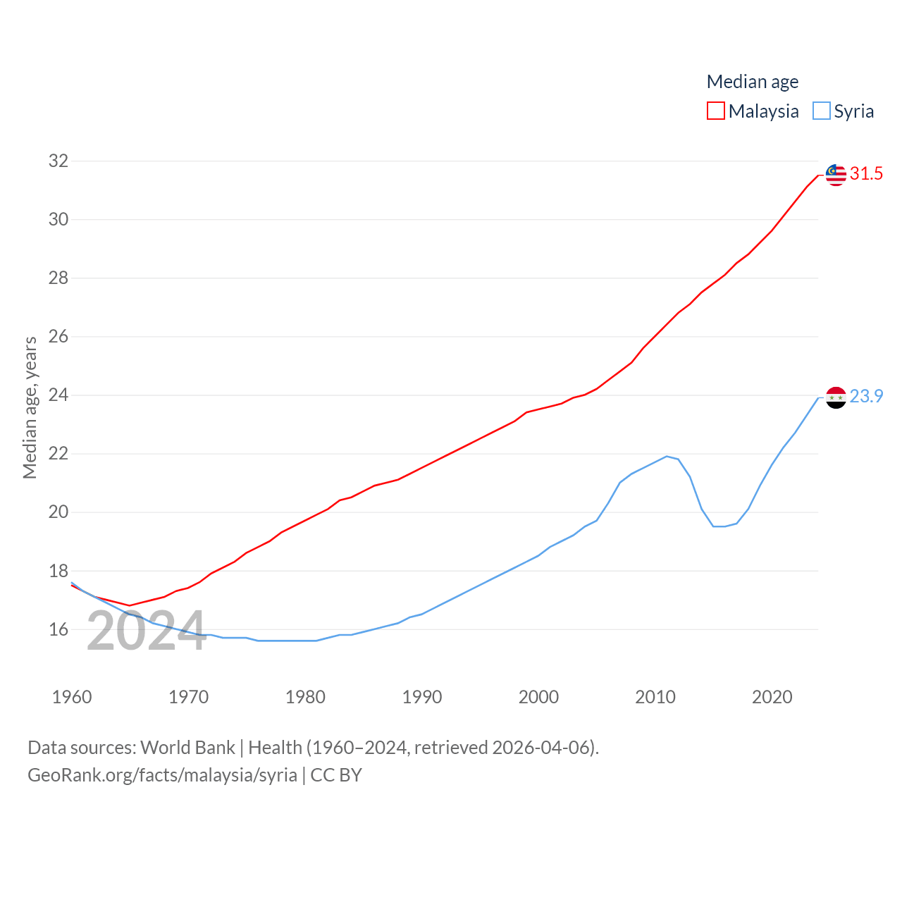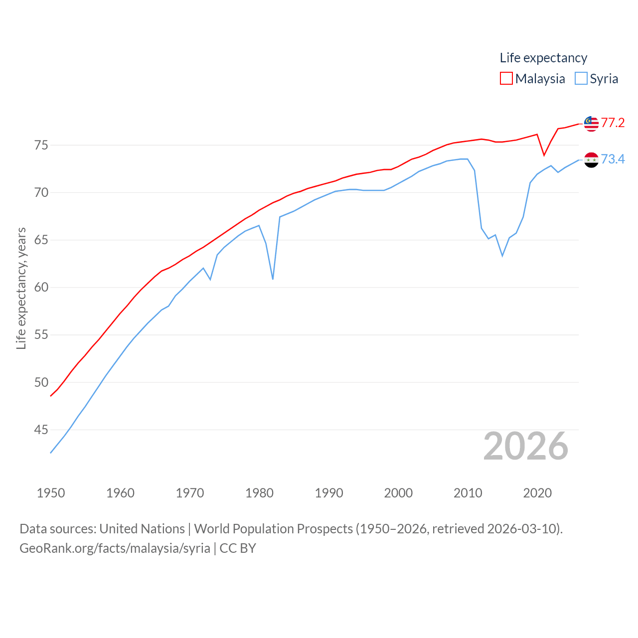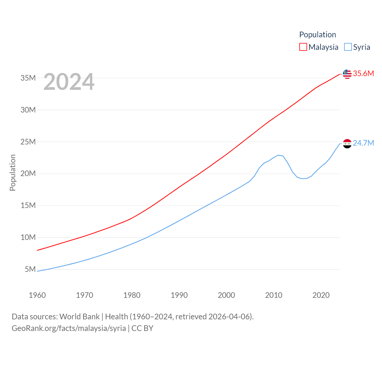 Malaysia has a population of 35.6M (ranked 44/197), compared with 24.7M in Syria (ranked 57/197). Malaysia's land area is 126,854 sq mi versus 70,900 sq mi for Syria (ranked 65th vs. 87th).