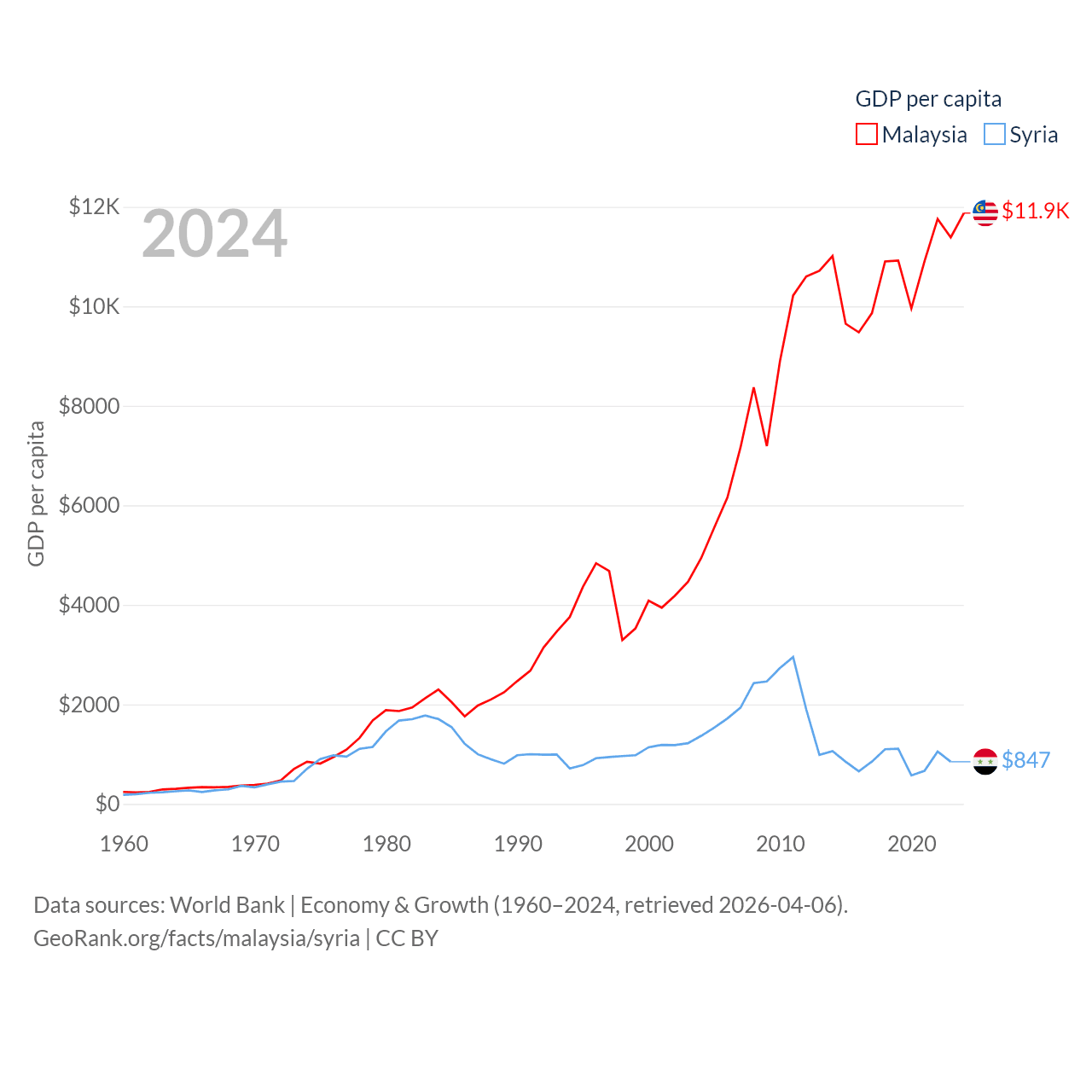 By GDP, Malaysia ranks 38/197 ($422B) and Syria ranks 129/197 ($20B). By GDP per capita, Malaysia ranks 79/197 ($11,874), while Syria ranks 185/197 ($847).