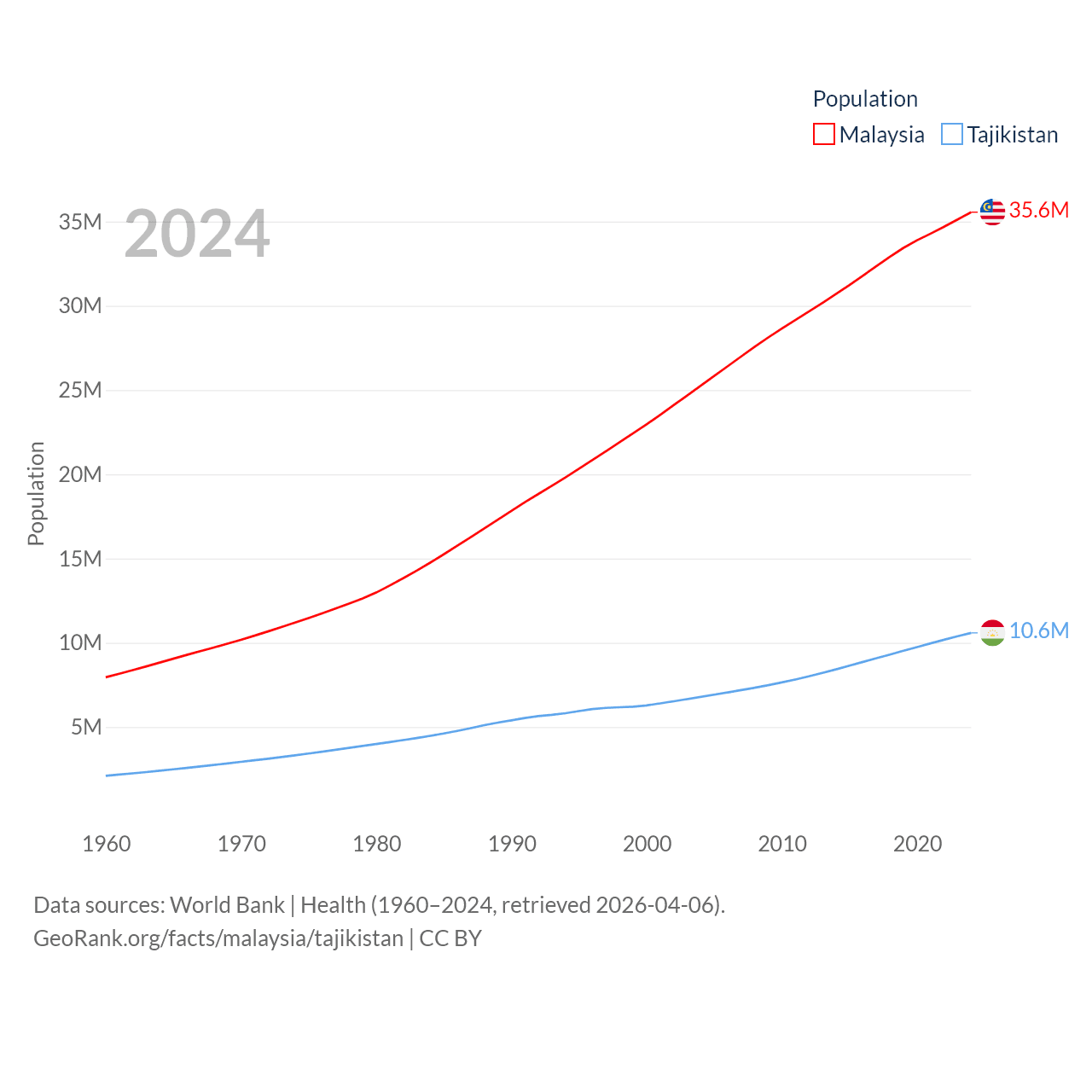 Malaysia has a population of 35.6M (ranked 44/197), compared with 10.6M in Tajikistan (ranked 91/197). Malaysia's land area is 126,854 sq mi versus 53,587 sq mi for Tajikistan (ranked 65th vs. 93rd).