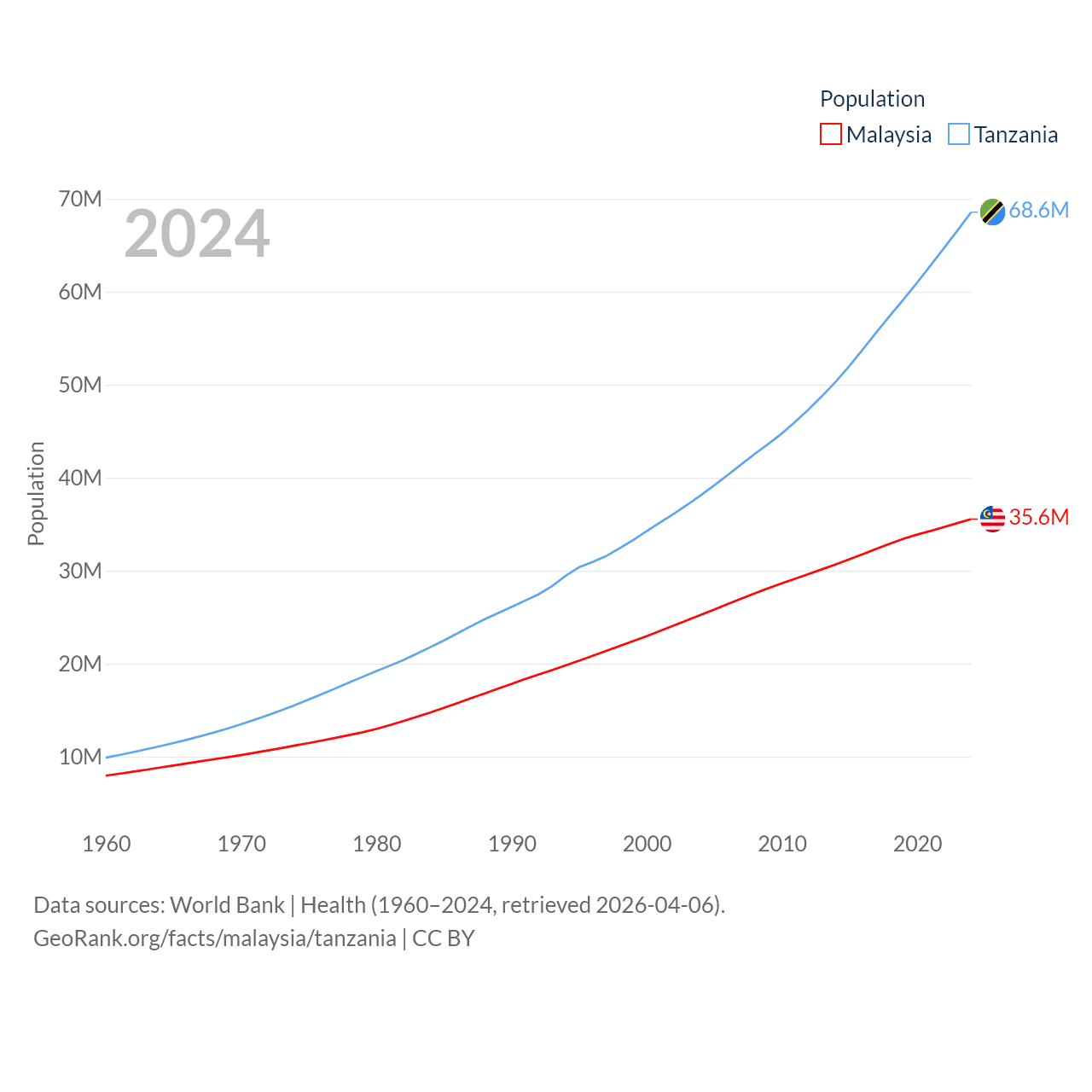 Malaysia has a population of 35.6M (ranked 44/197), compared with 68.6M in Tanzania (ranked 22/197). Malaysia's land area is 126,854 sq mi versus 342,009 sq mi for Tanzania (ranked 65th vs. 31st).