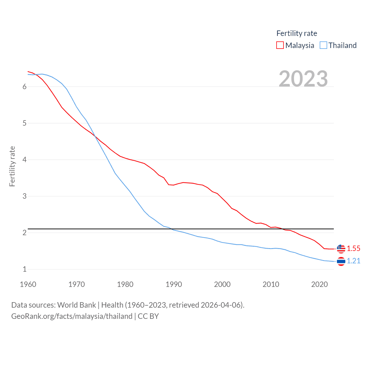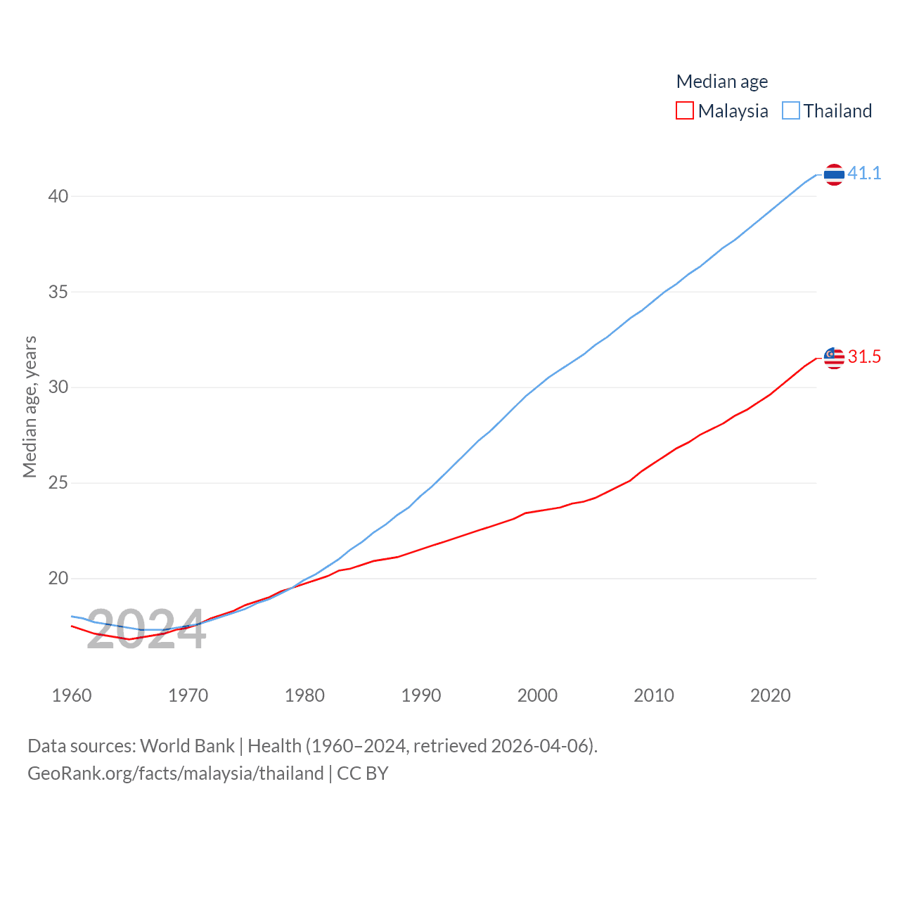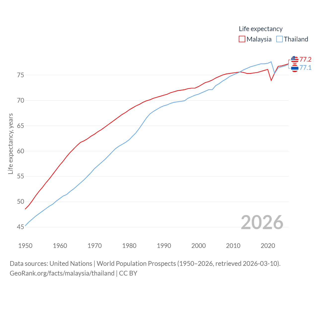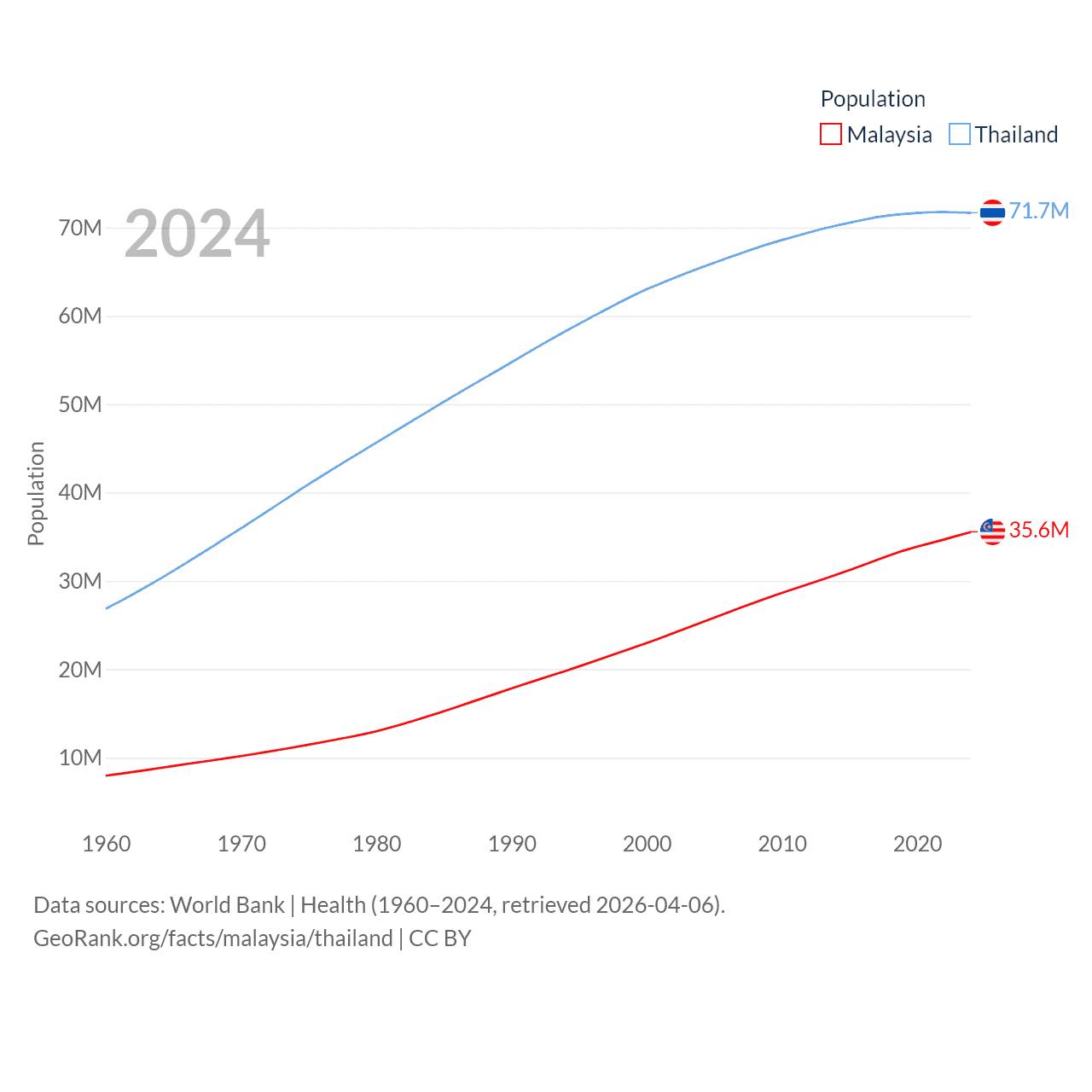 Malaysia has a population of 35.6M (ranked 44/197), compared with 71.7M in Thailand (ranked 20/197). Malaysia's land area is 126,854 sq mi versus 197,256 sq mi for Thailand (ranked 65th vs. 50th).