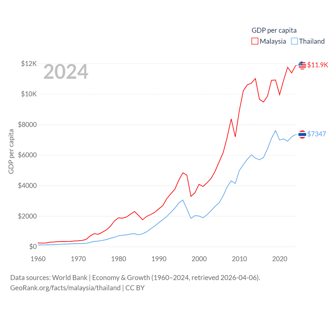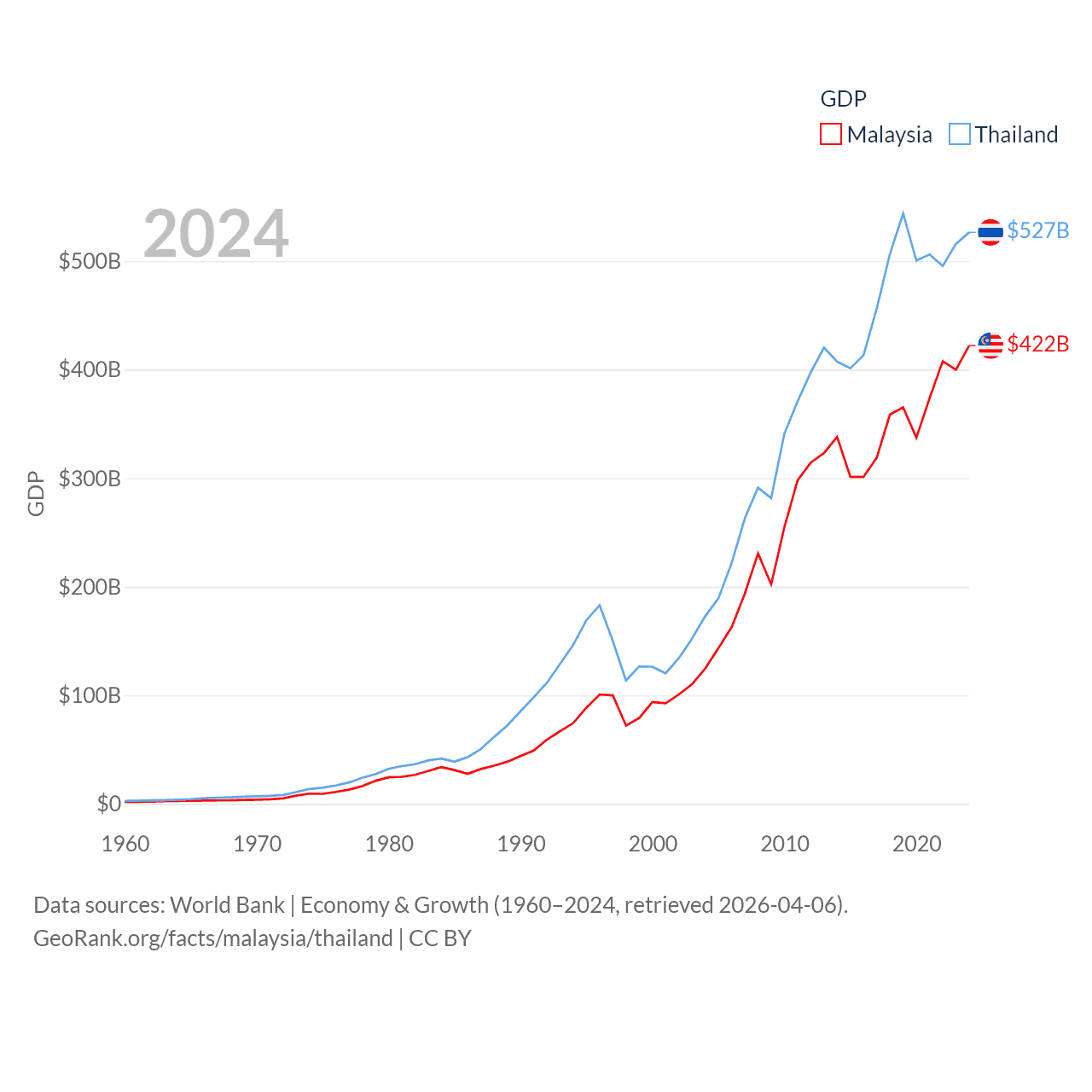 By GDP, Malaysia ranks 38/197 ($422B) and Thailand ranks 31/197 ($527B). By GDP per capita, Malaysia ranks 79/197 ($11,874), while Thailand ranks 100/197 ($7,347).