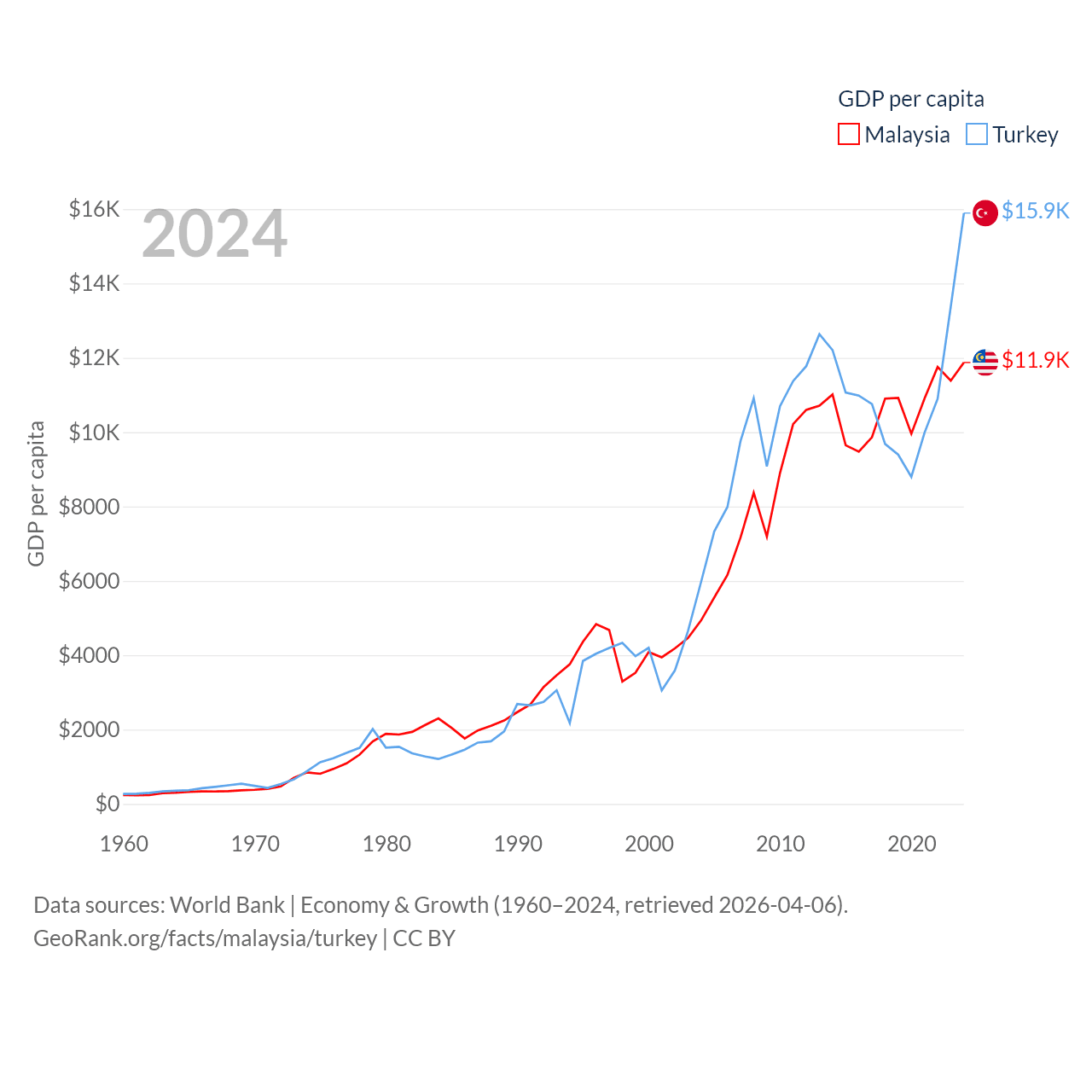 By GDP, Malaysia ranks 38/197 ($422B) and Turkey ranks 17/197 ($1.36T). By GDP per capita, Malaysia ranks 79/197 ($11,874), while Turkey ranks 66/197 ($15,893).