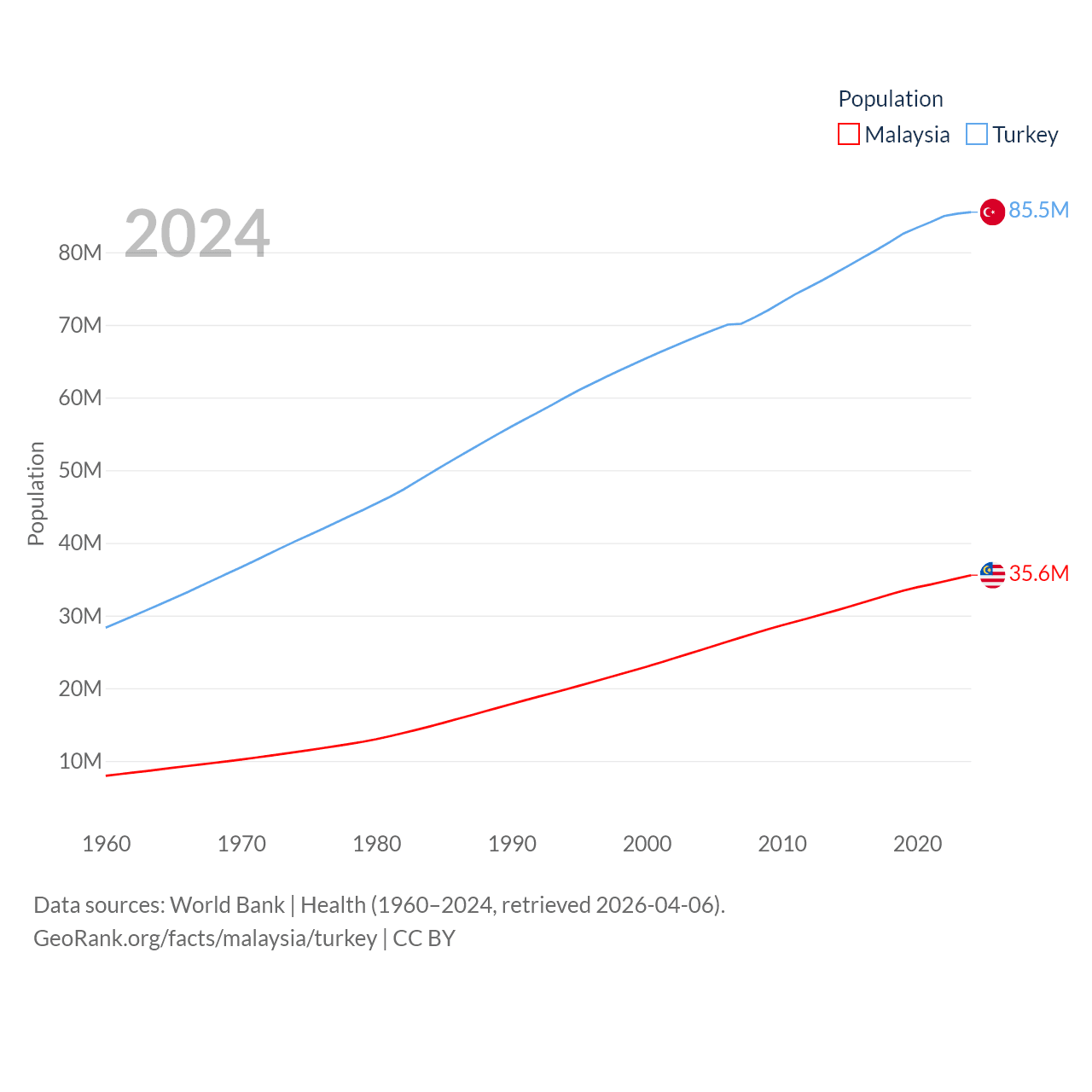 Malaysia has a population of 35.6M (ranked 44/197), compared with 85.5M in Turkey (ranked 18/197). Malaysia's land area is 126,854 sq mi versus 297,156 sq mi for Turkey (ranked 65th vs. 36th).