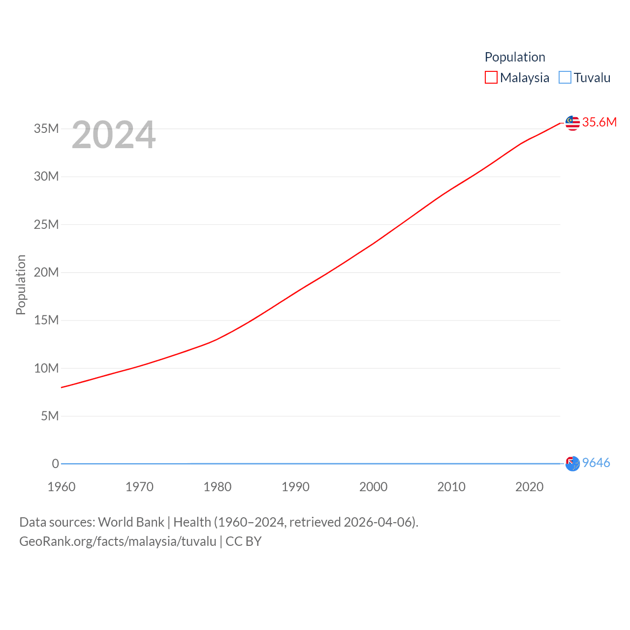 Malaysia has a population of 35.6M (ranked 44/197), compared with 9.65K in Tuvalu (ranked 196/197). Malaysia's land area is 126,854 sq mi versus 11.6 sq mi for Tuvalu (ranked 65th vs. 194th).