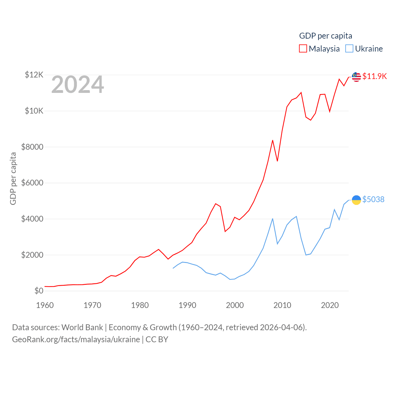 By GDP, Malaysia ranks 38/197 ($422B) and Ukraine ranks 57/197 ($191B). By GDP per capita, Malaysia ranks 79/197 ($11,874), while Ukraine ranks 120/197 ($5,038).