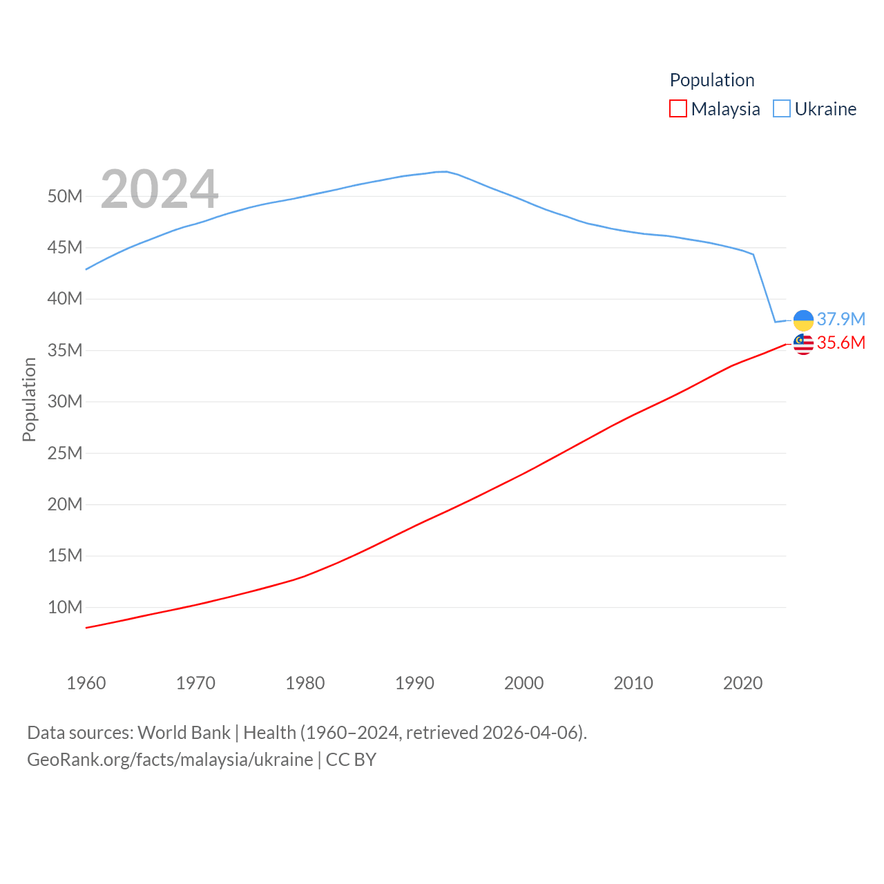 Malaysia has a population of 35.6M (ranked 44/197), compared with 37.9M in Ukraine (ranked 41/197). Malaysia's land area is 126,854 sq mi versus 223,708 sq mi for Ukraine (ranked 65th vs. 46th).