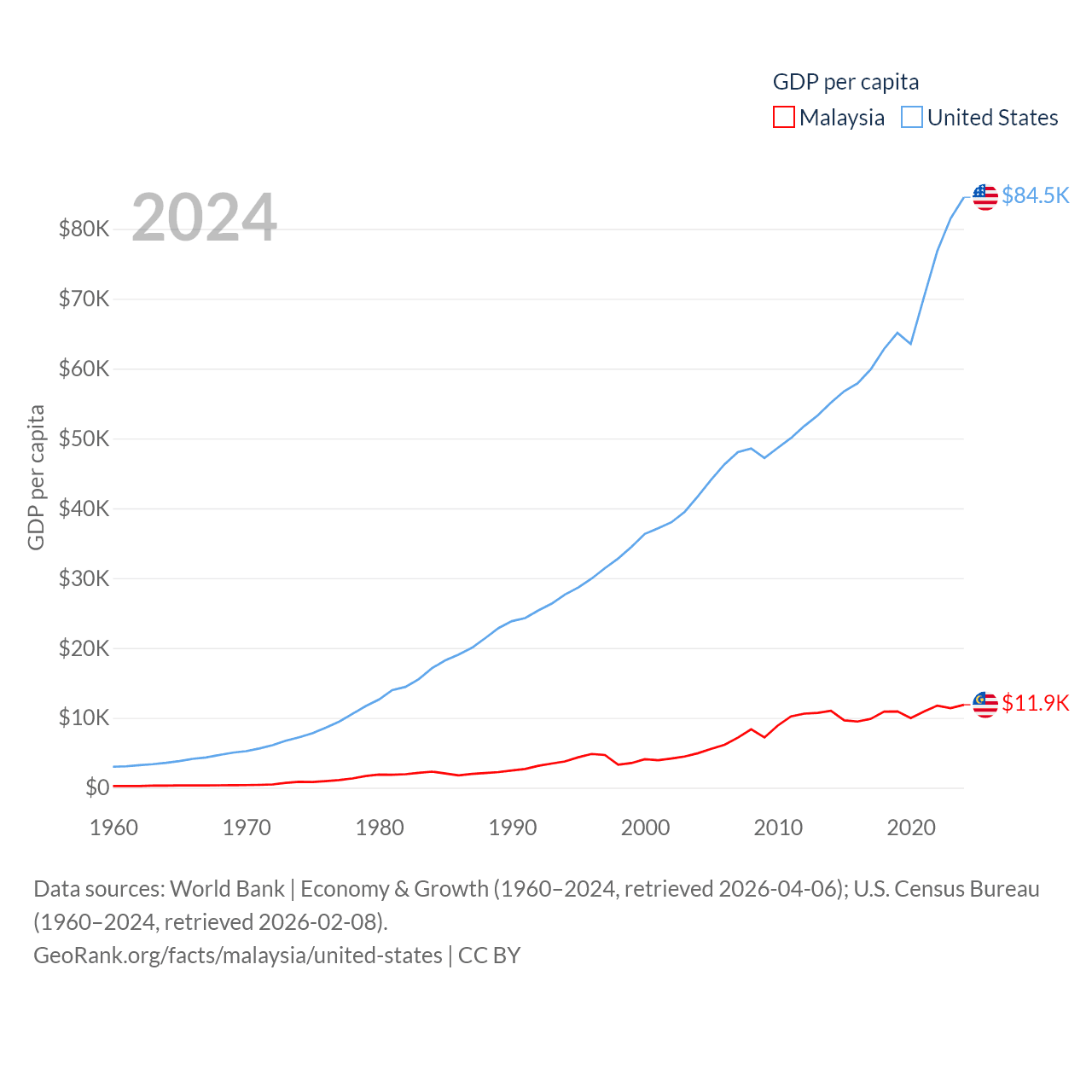 By GDP, Malaysia ranks 38/197 ($422B) and The United States ranks 1/197 ($28.8T). By GDP per capita, Malaysia ranks 79/197 ($11,874), while The United States ranks 10/197 ($84,534).