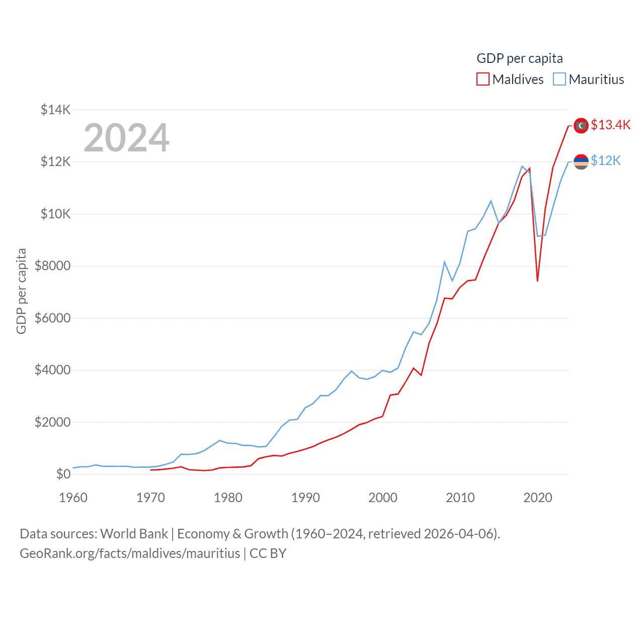 By GDP, Maldives ranks 159/197 ($7.06B) and Mauritius ranks 143/197 ($14.9B). By GDP per capita, Maldives ranks 75/197 ($13,379), while Mauritius ranks 78/197 ($11,991).