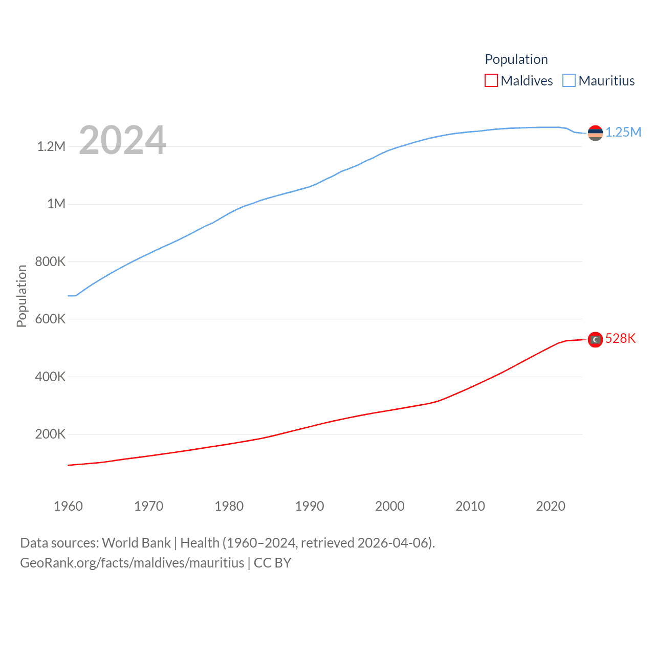 Maldives has a population of 528K (ranked 168/197), compared with 1.25M in Mauritius (ranked 156/197). Maldives' land area is 115.1 sq mi versus 771 sq mi for Mauritius (ranked 188th vs. 170th).
