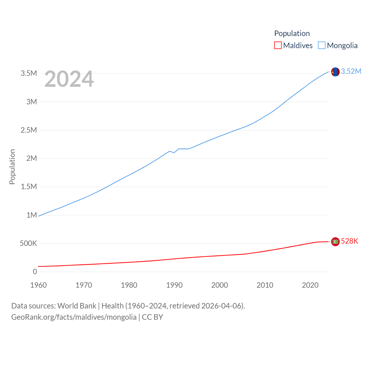 Maldives has a population of 528K (ranked 168/197), compared with 3.52M in Mongolia (ranked 132/197). Maldives' land area is 115.1 sq mi versus 601,740 sq mi for Mongolia (ranked 188th vs. 18th).