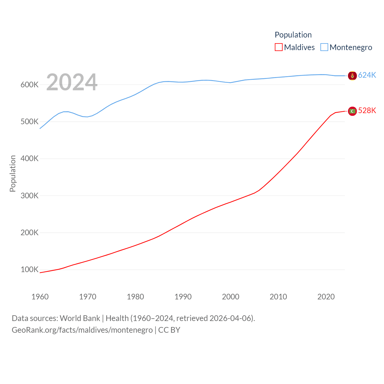 Maldives has a population of 528K (ranked 168/197), compared with 624K in Montenegro (ranked 166/197). Maldives' land area is 115.1 sq mi versus 5,193 sq mi for Montenegro (ranked 188th vs. 156th).