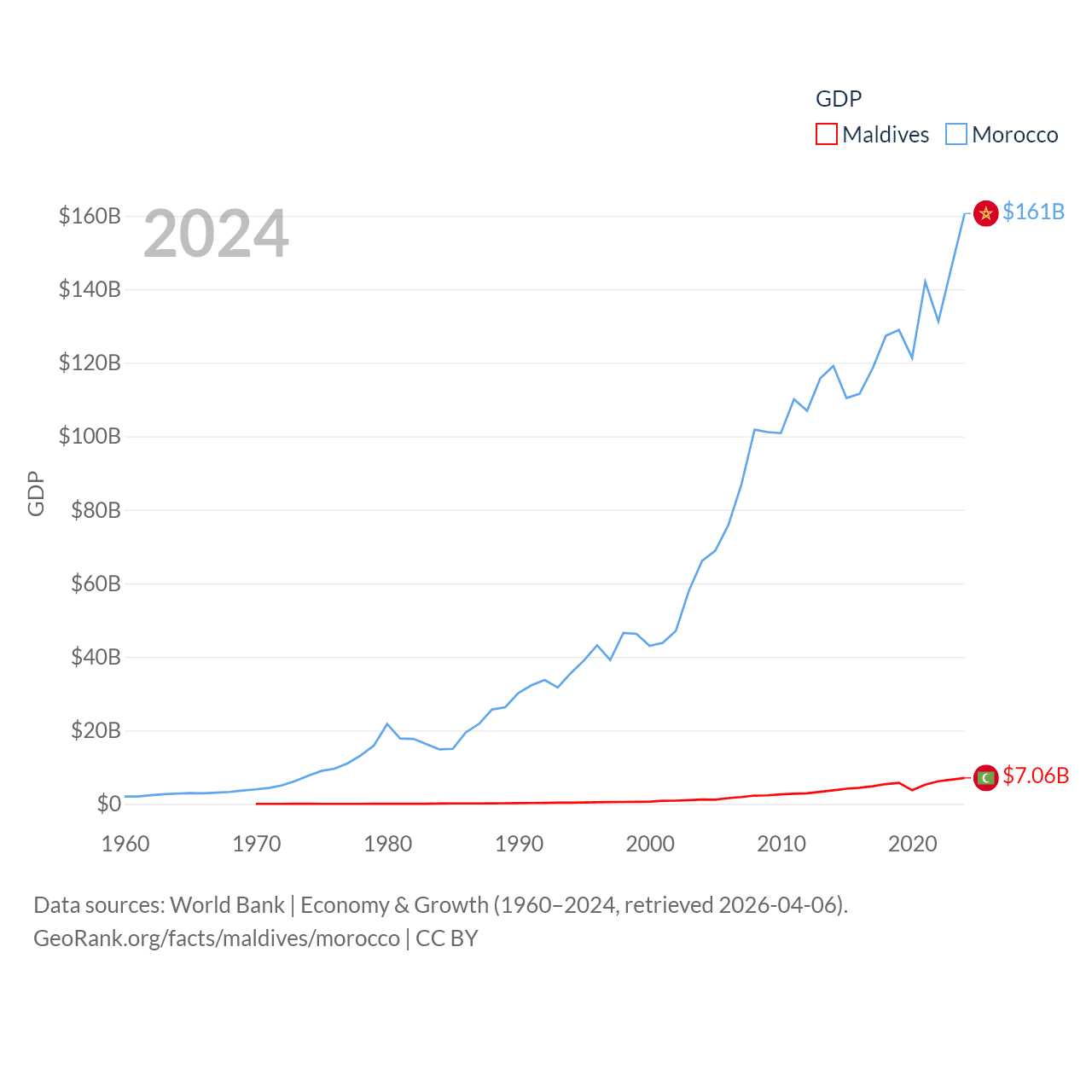 By GDP, Maldives ranks 159/197 ($7.06B) and Morocco ranks 58/197 ($161B). By GDP per capita, Maldives ranks 75/197 ($13,379), while Morocco ranks 127/197 ($4,218).