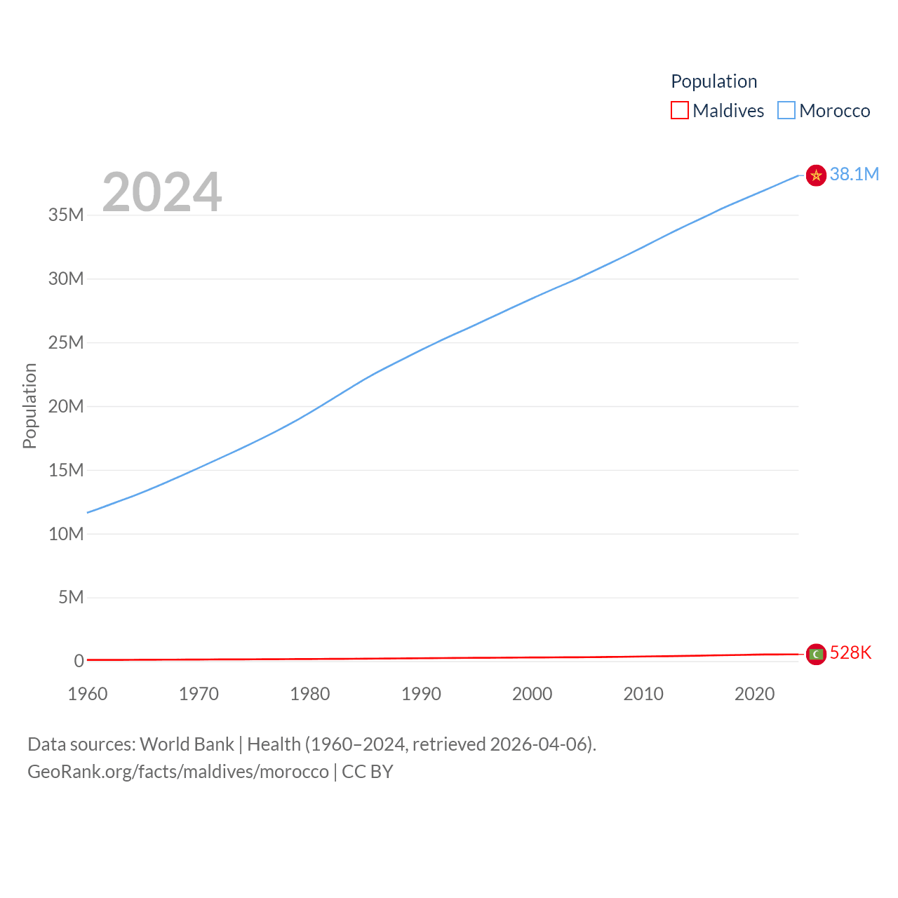 Maldives has a population of 528K (ranked 168/197), compared with 38.1M in Morocco (ranked 39/197). Maldives' land area is 115.1 sq mi versus 172,317 sq mi for Morocco (ranked 188th vs. 55th).