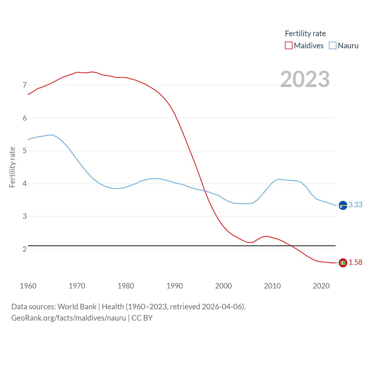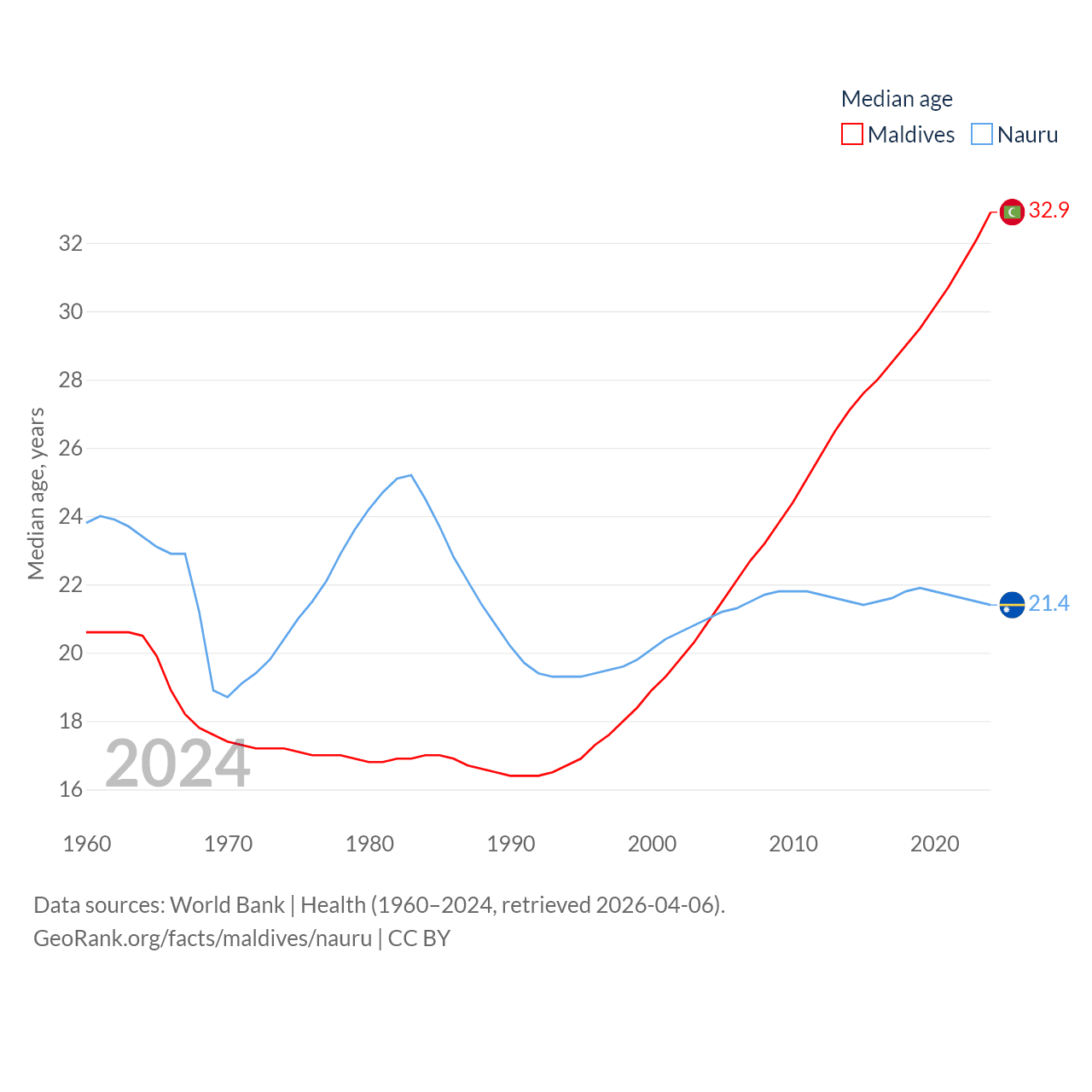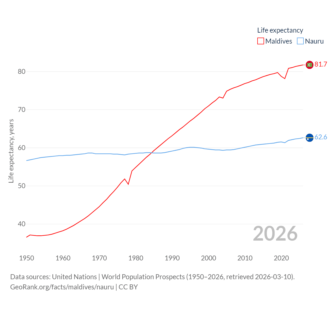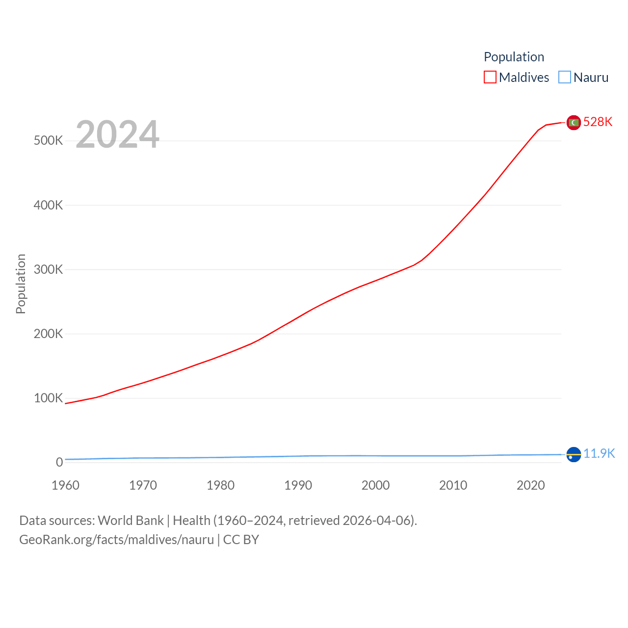 Maldives has a population of 528K (ranked 168/197), compared with 11.9K in Nauru (ranked 195/197). Maldives' land area is 115.1 sq mi versus 7.72 sq mi for Nauru (ranked 188th vs. 195th).