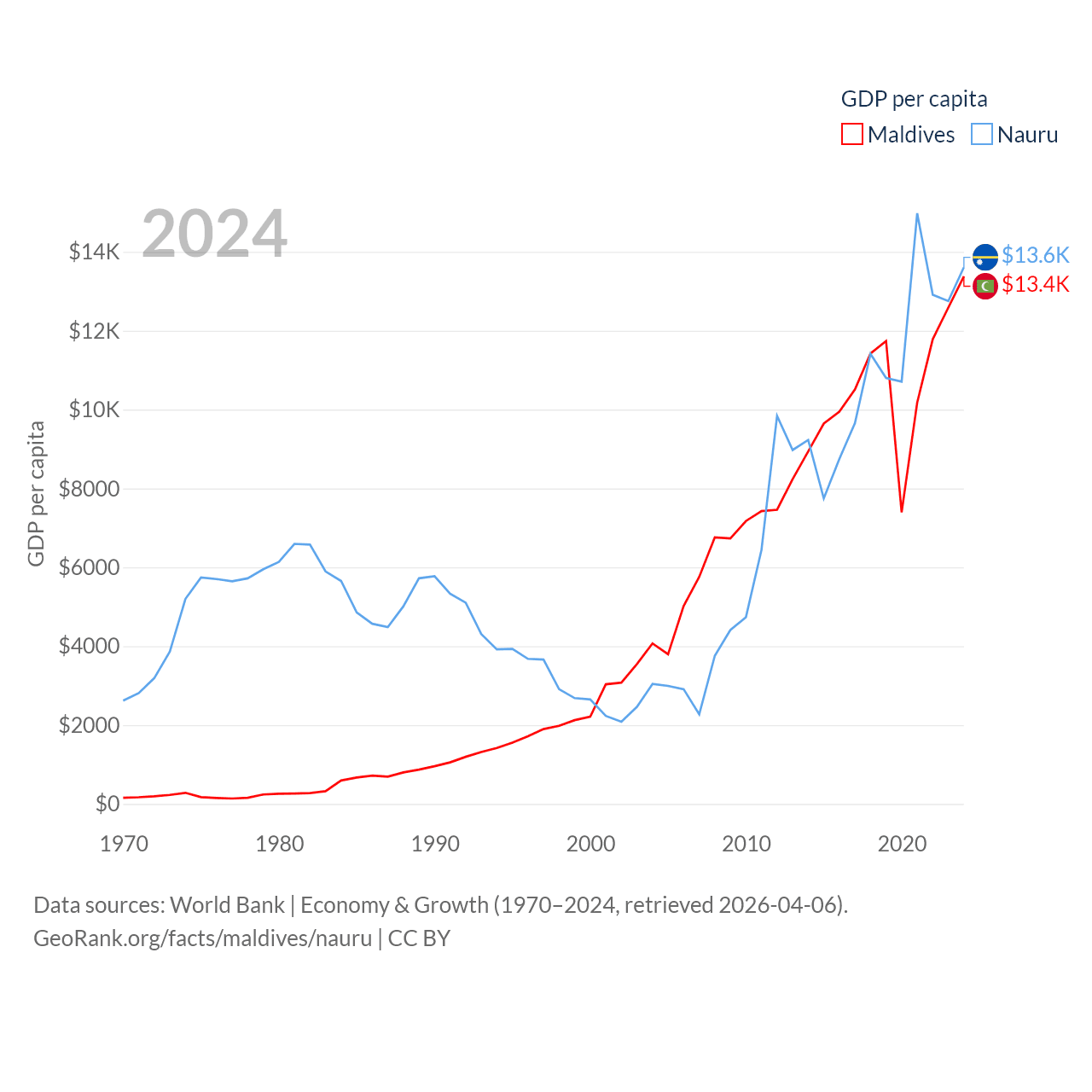 By GDP, Maldives ranks 159/197 ($7.06B) and Nauru ranks 195/197 ($163M). By GDP per capita, Maldives ranks 75/197 ($13,379), while Nauru ranks 74/197 ($13,609).