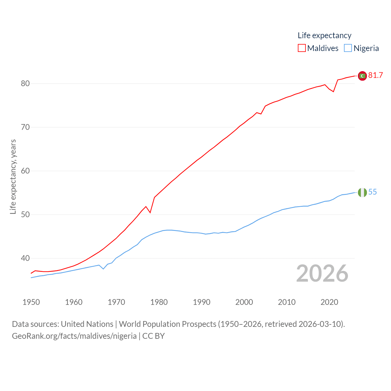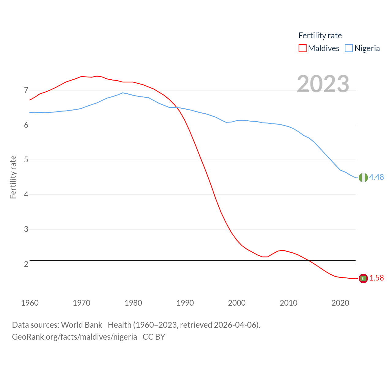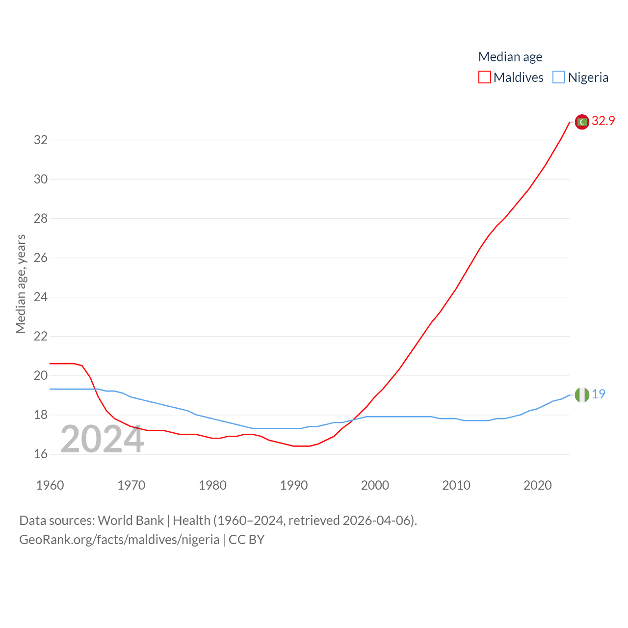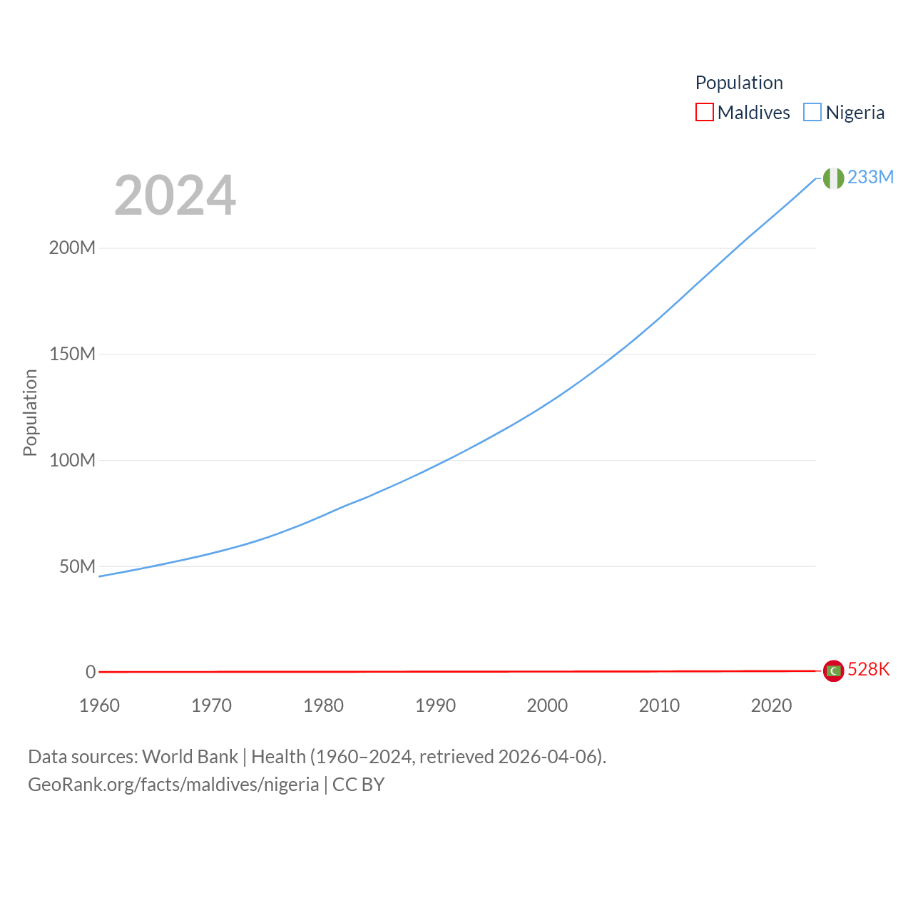 Maldives has a population of 528K (ranked 168/197), compared with 233M in Nigeria (ranked 6/197). Maldives' land area is 115.1 sq mi versus 351,650 sq mi for Nigeria (ranked 188th vs. 30th).