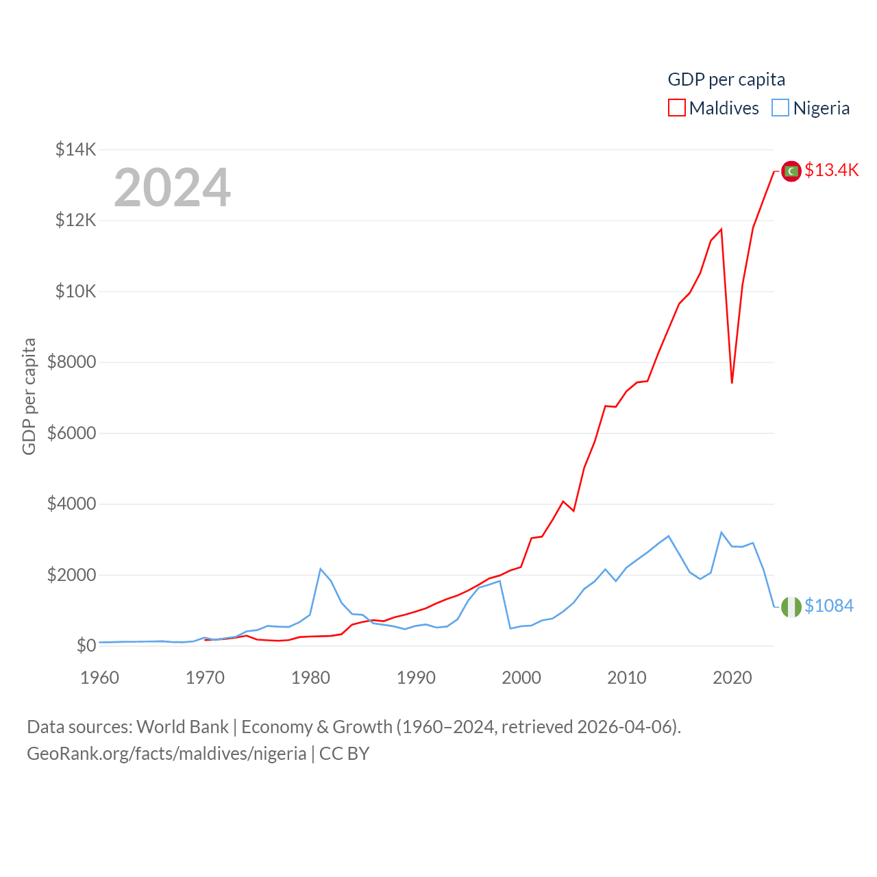 By GDP, Maldives ranks 159/197 ($7.06B) and Nigeria ranks 54/197 ($252B). By GDP per capita, Maldives ranks 75/197 ($13,379), while Nigeria ranks 174/197 ($1,084).