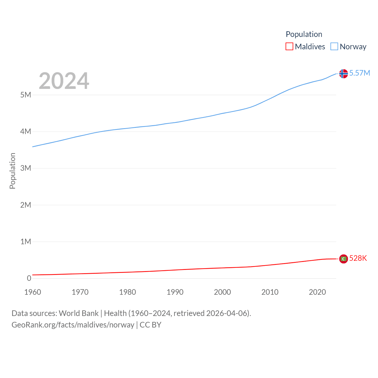 Maldives has a population of 528K (ranked 168/197), compared with 5.57M in Norway (ranked 118/197). Maldives' land area is 115.1 sq mi versus 140,645 sq mi for Norway (ranked 188th vs. 62nd).
