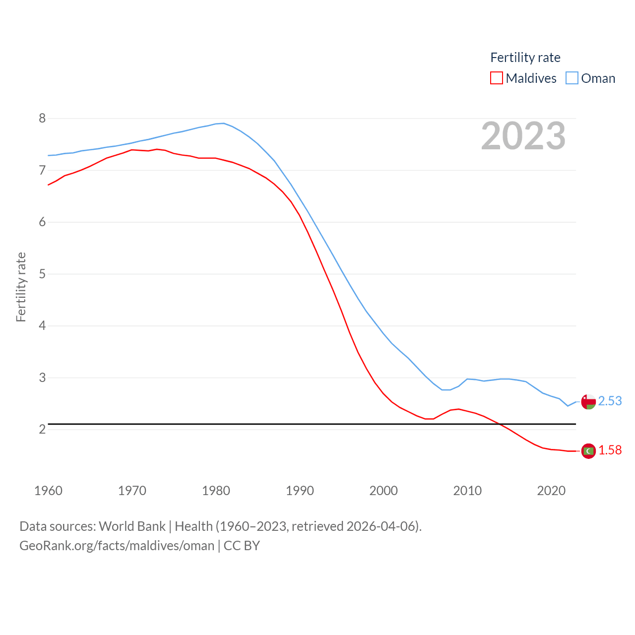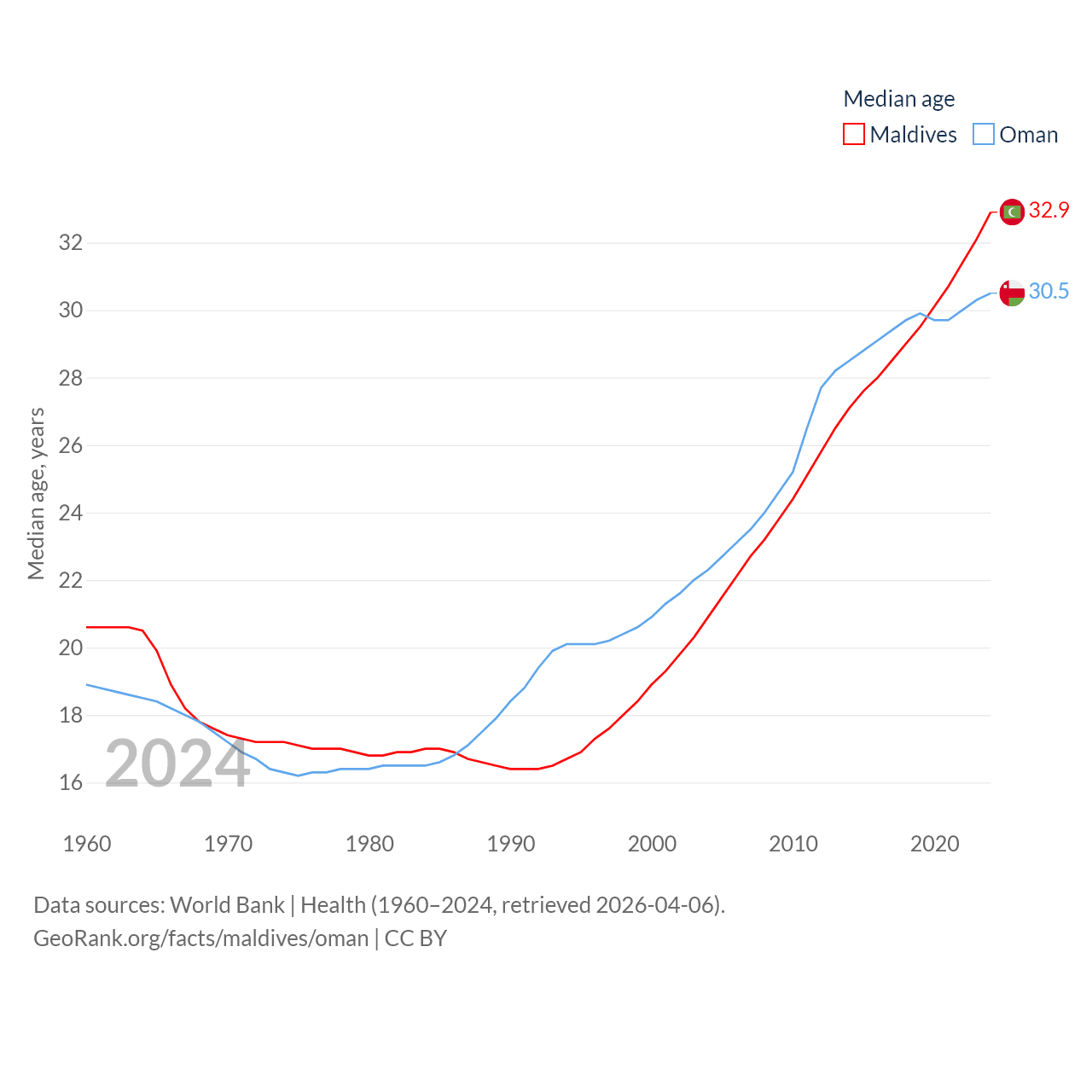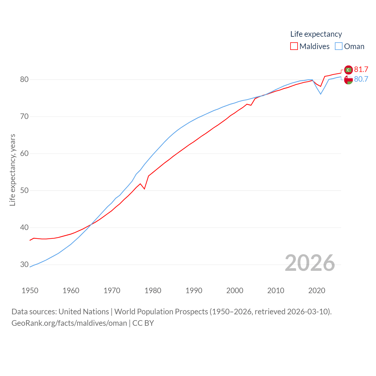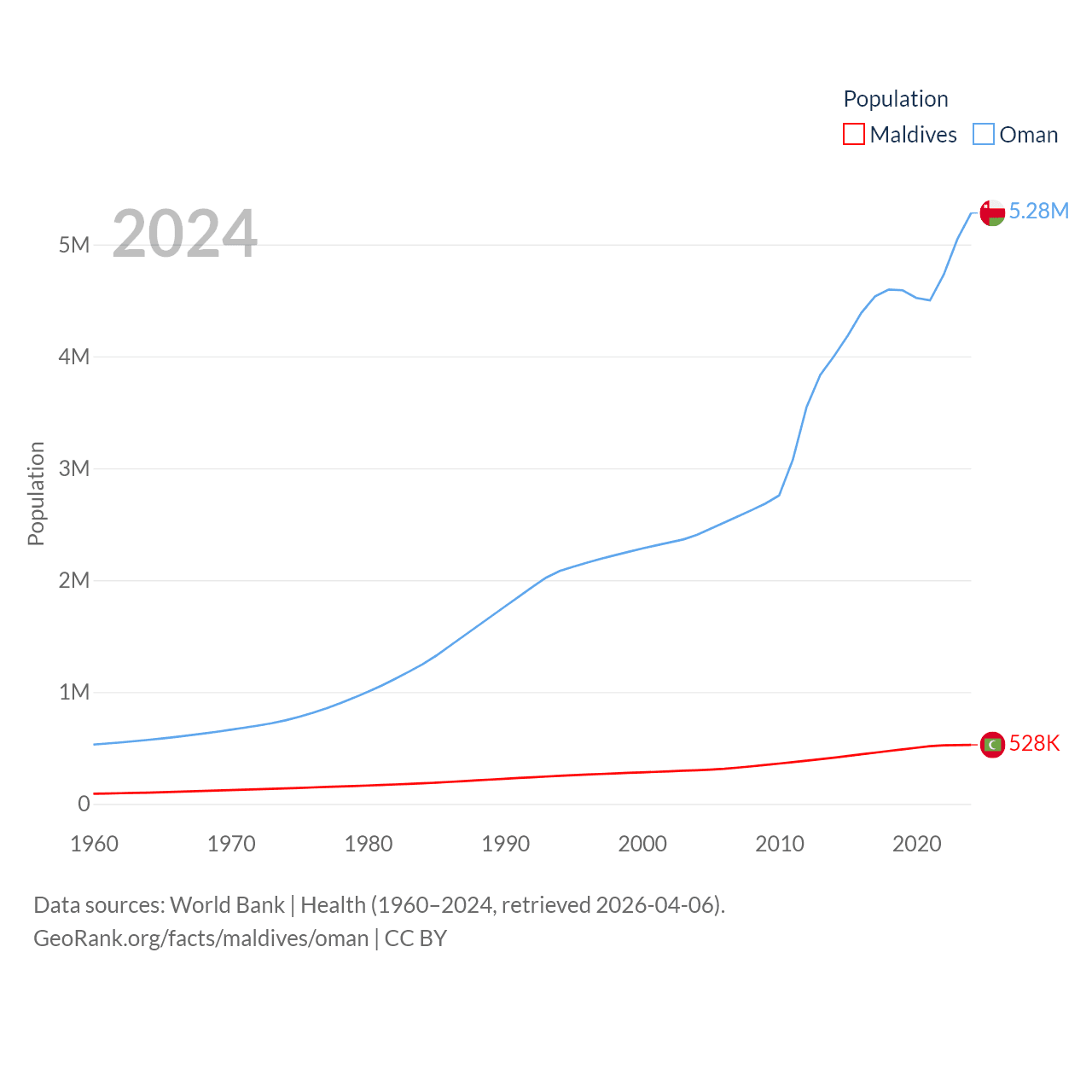 Maldives has a population of 528K (ranked 168/197), compared with 5.28M in Oman (ranked 124/197). Maldives' land area is 115.1 sq mi versus 119,499 sq mi for Oman (ranked 188th vs. 68th).