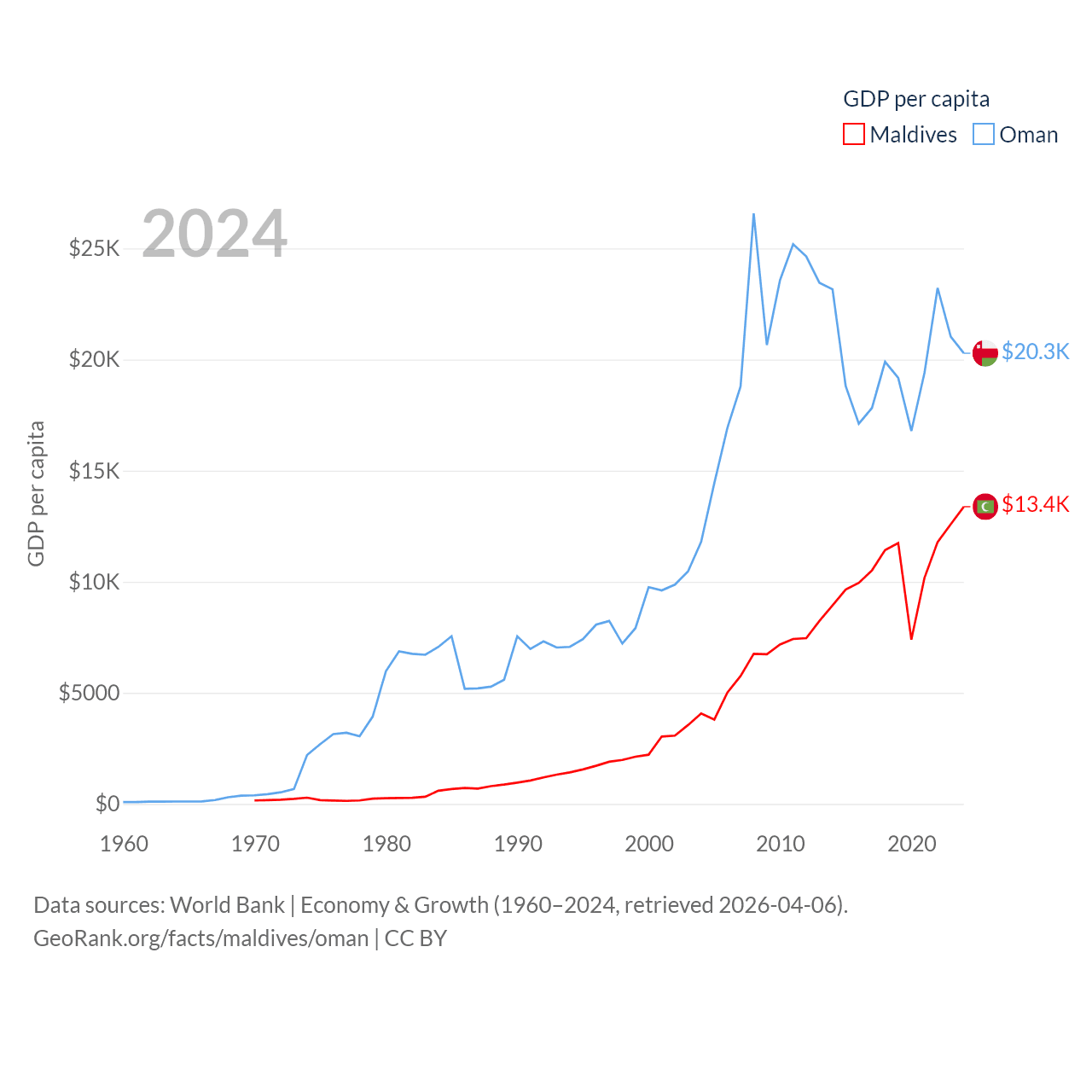 By GDP, Maldives ranks 159/197 ($7.06B) and Oman ranks 70/197 ($107B). By GDP per capita, Maldives ranks 75/197 ($13,379), while Oman ranks 57/197 ($20,285).
