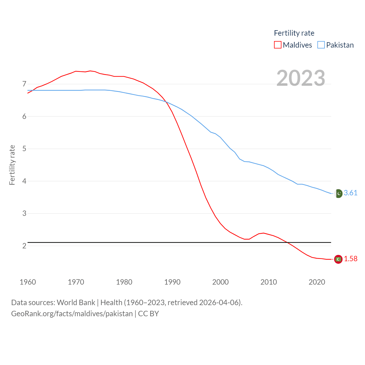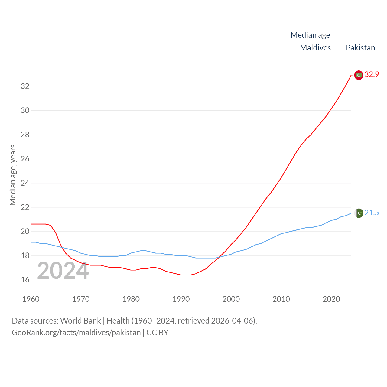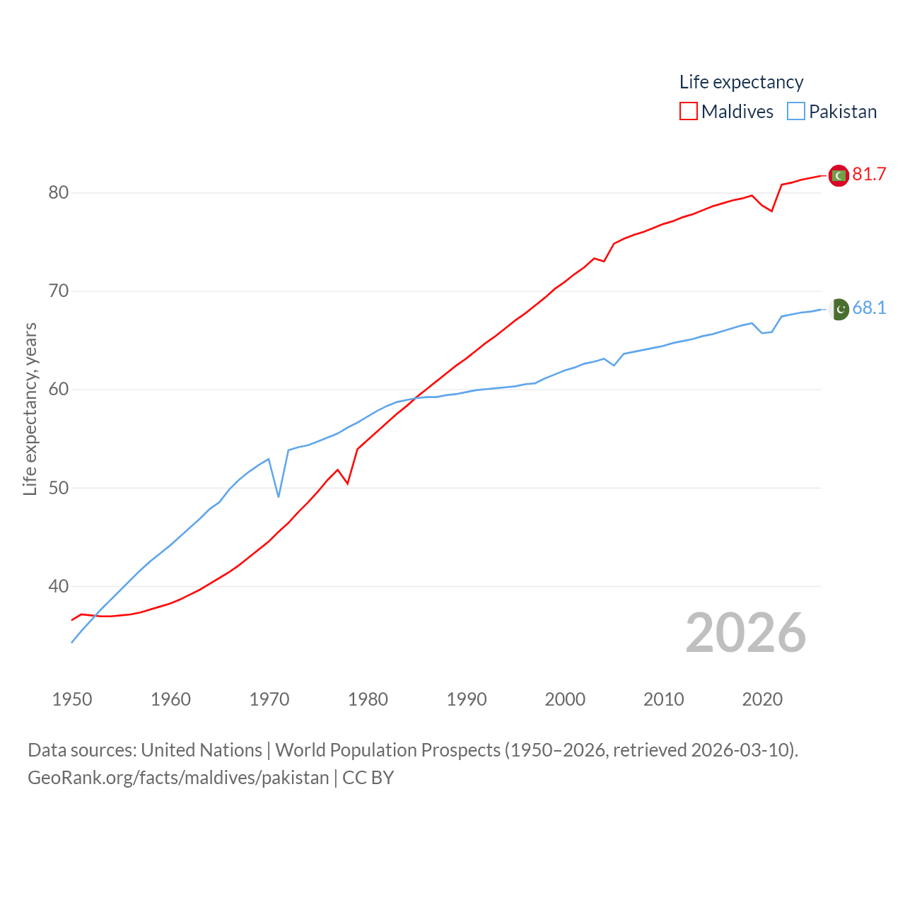 Maldives has a population of 528K (ranked 168/197), compared with 251M in Pakistan (ranked 5/197). Maldives' land area is 115.1 sq mi versus 297,638 sq mi for Pakistan (ranked 188th vs. 35th).