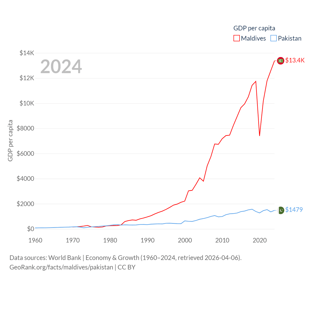 By GDP, Maldives ranks 159/197 ($7.06B) and Pakistan ranks 43/197 ($372B). By GDP per capita, Maldives ranks 75/197 ($13,379), while Pakistan ranks 163/197 ($1,479).