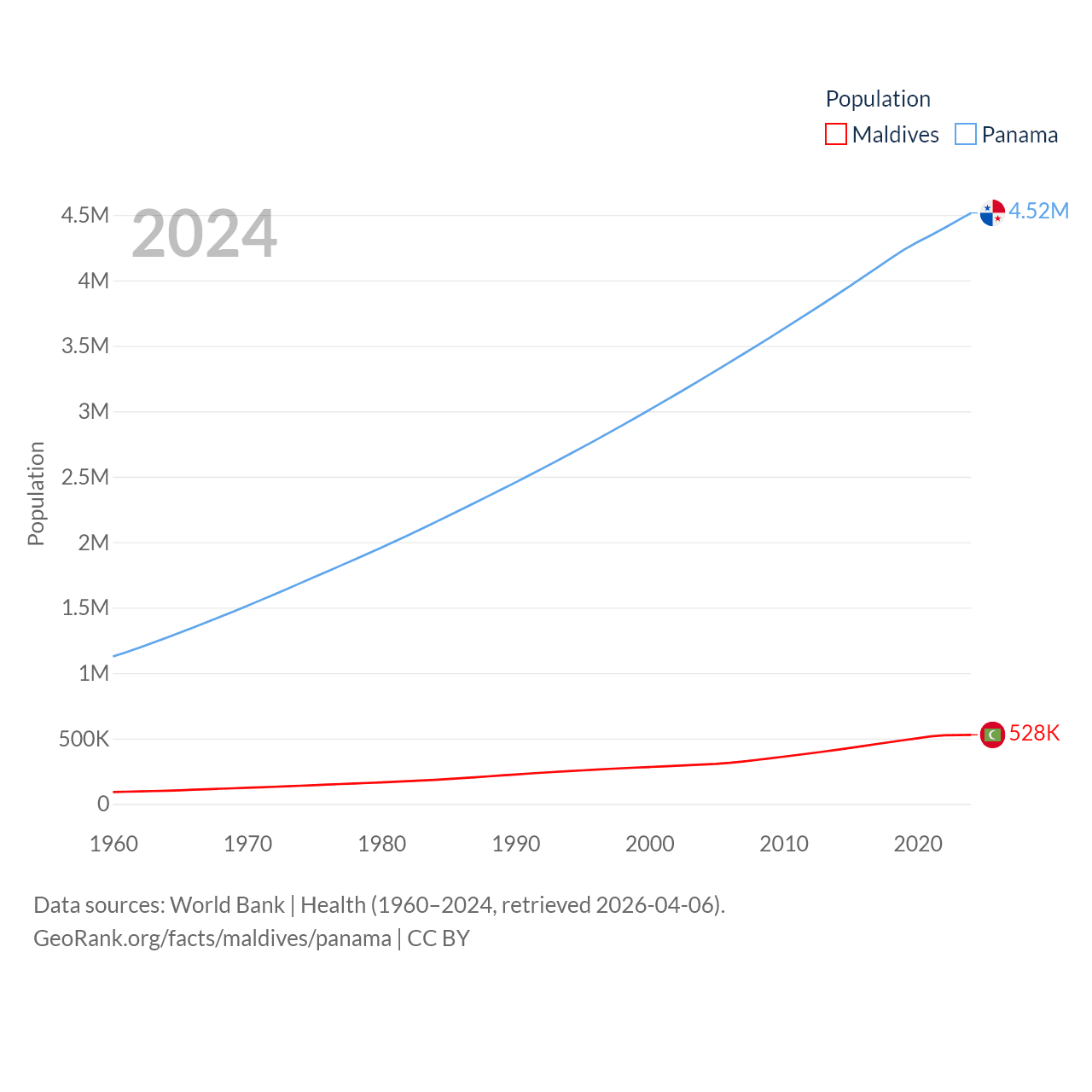 Maldives has a population of 528K (ranked 168/197), compared with 4.52M in Panama (ranked 128/197). Maldives' land area is 115.1 sq mi versus 28,641 sq mi for Panama (ranked 188th vs. 115th).