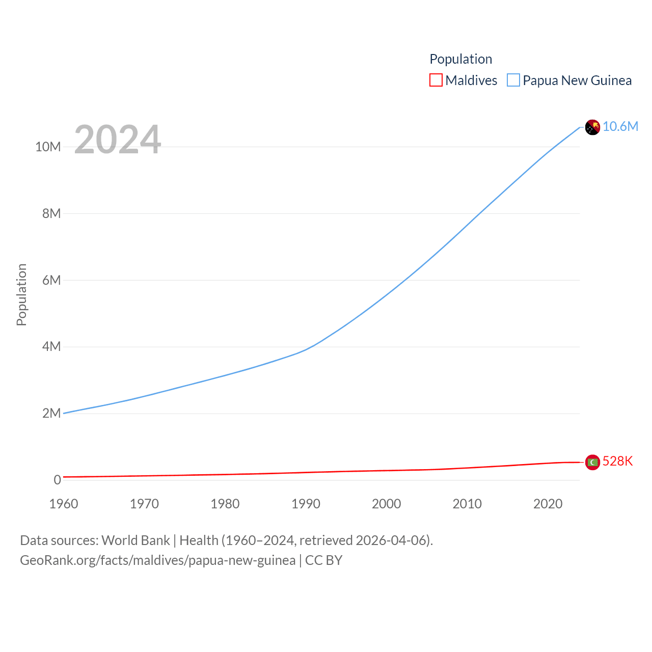 Maldives has a population of 528K (ranked 168/197), compared with 10.6M in Papua New Guinea (ranked 92/197). Maldives' land area is 115.1 sq mi versus 174,850 sq mi for Papua New Guinea (ranked 188th vs. 54th).