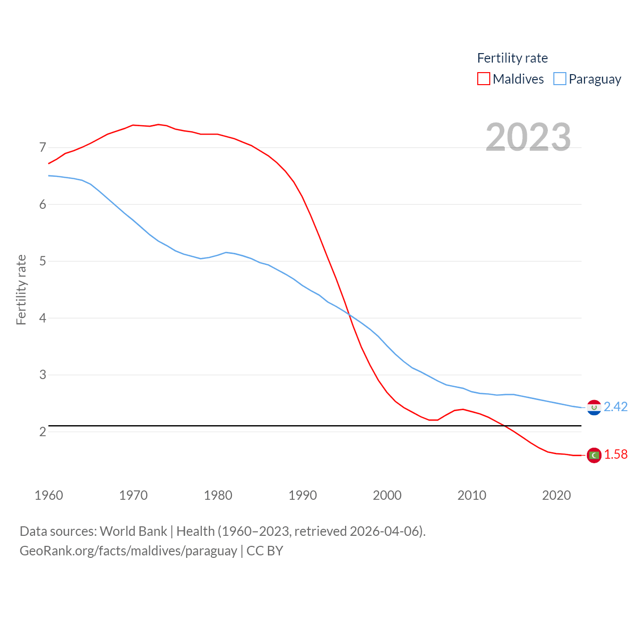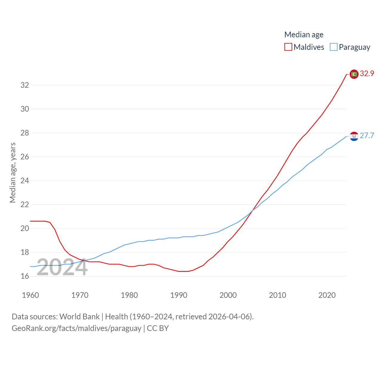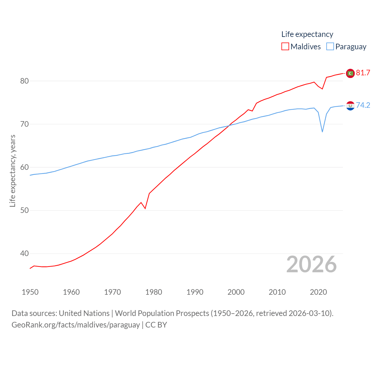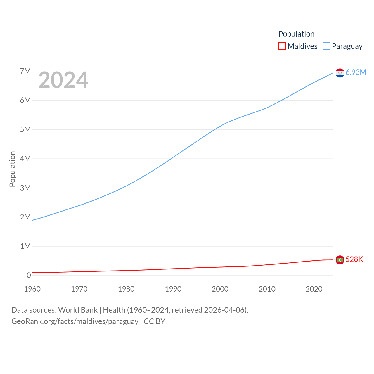 Maldives has a population of 528K (ranked 168/197), compared with 6.93M in Paraguay (ranked 107/197). Maldives' land area is 115.1 sq mi versus 152,901 sq mi for Paraguay (ranked 188th vs. 59th).