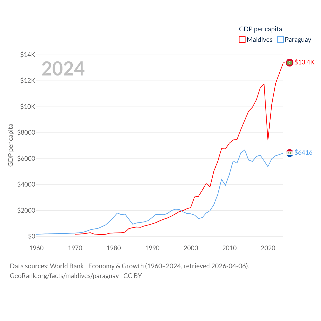 By GDP, Maldives ranks 159/197 ($7.06B) and Paraguay ranks 98/197 ($44.5B). By GDP per capita, Maldives ranks 75/197 ($13,379), while Paraguay ranks 109/197 ($6,416).