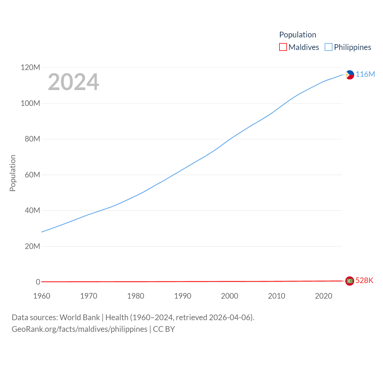 Maldives has a population of 528K (ranked 168/197), compared with 116M in The Philippines (ranked 14/197). Maldives' land area is 115.1 sq mi versus 115,124 sq mi for The Philippines (ranked 188th vs. 71st).