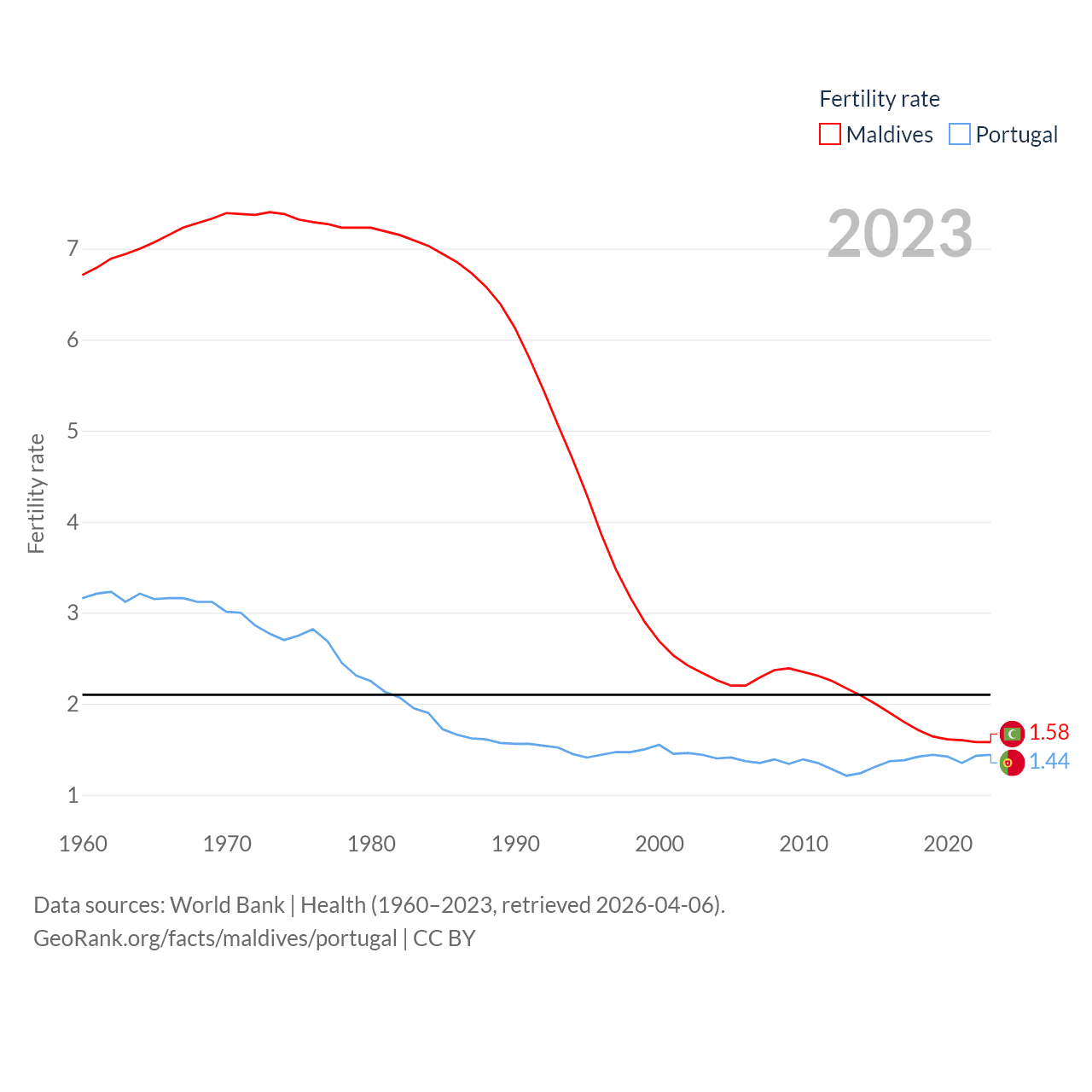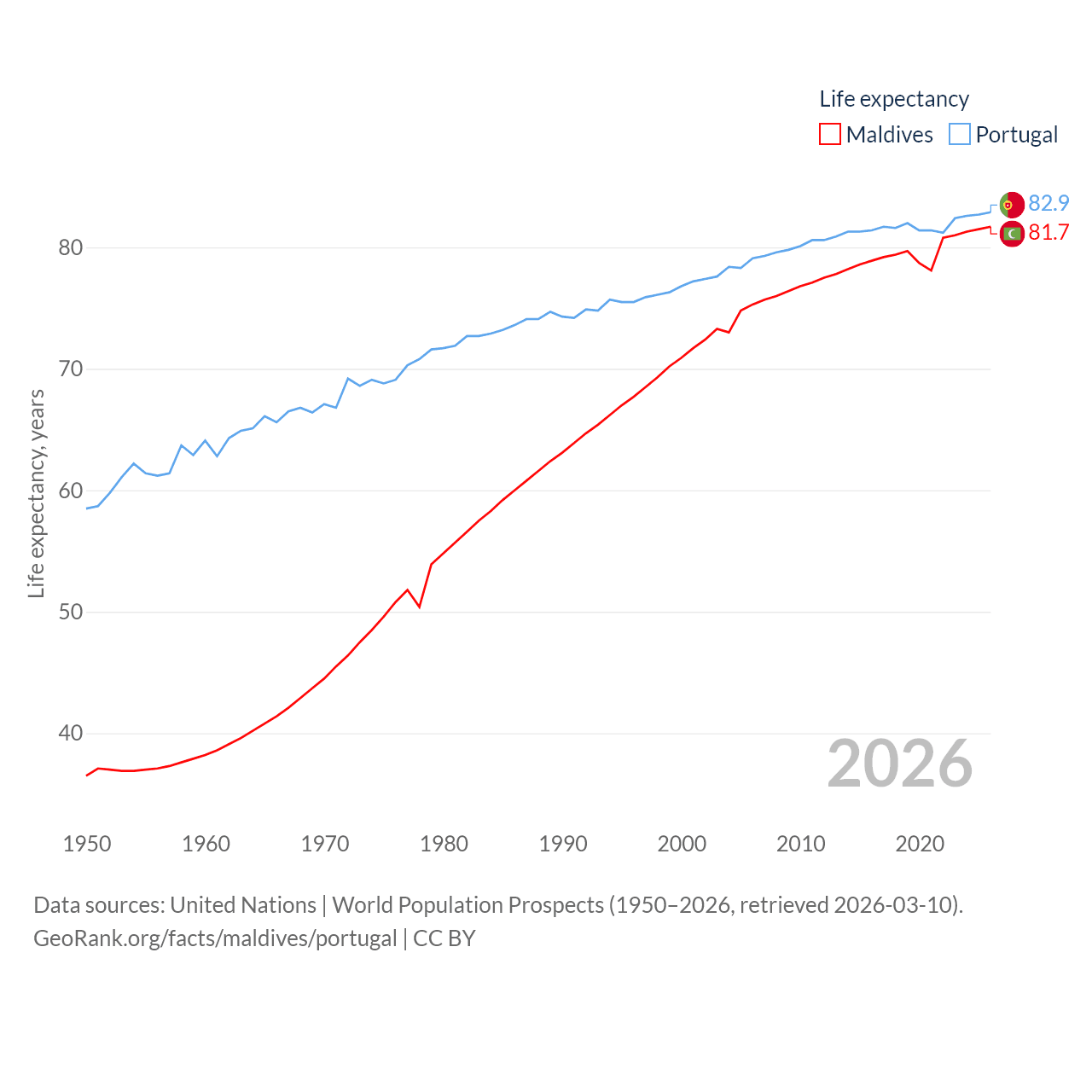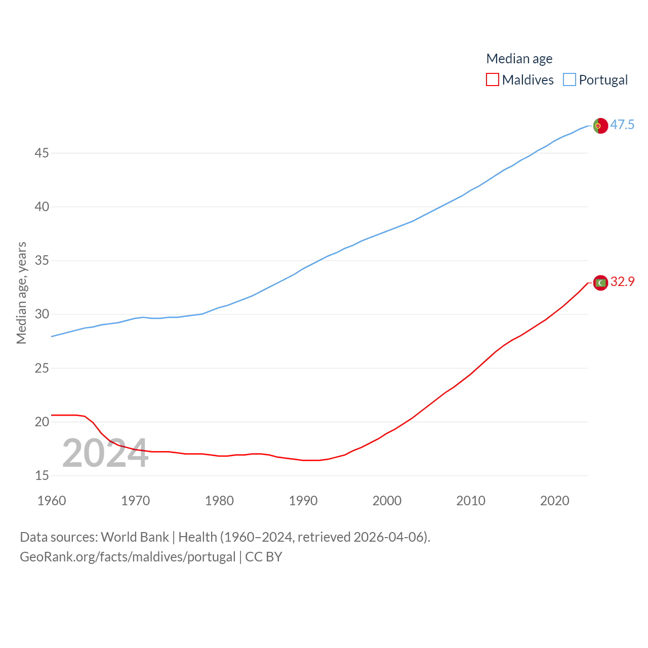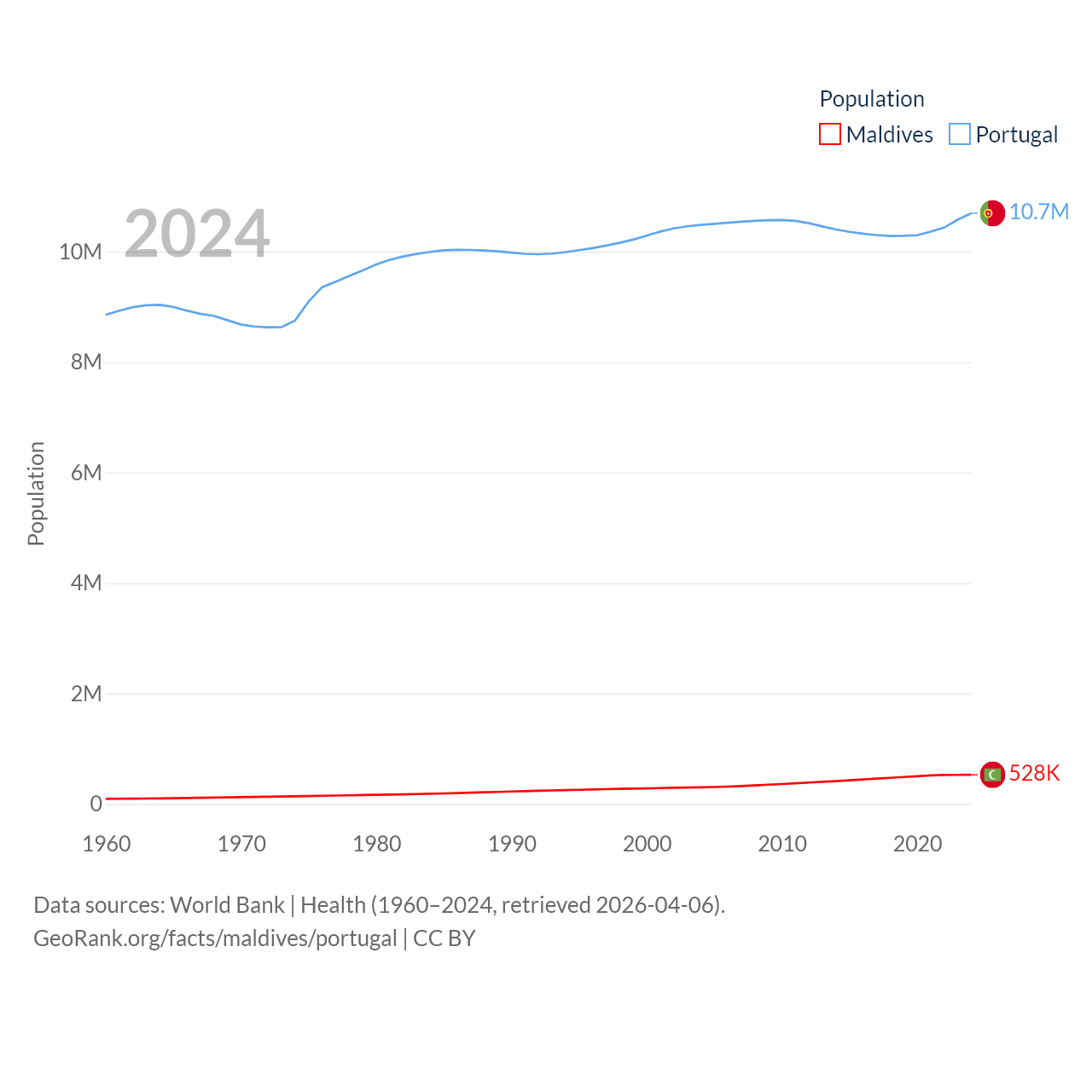 Maldives has a population of 528K (ranked 168/197), compared with 10.7M in Portugal (ranked 90/197). Maldives' land area is 115.1 sq mi versus 35,369 sq mi for Portugal (ranked 188th vs. 108th).