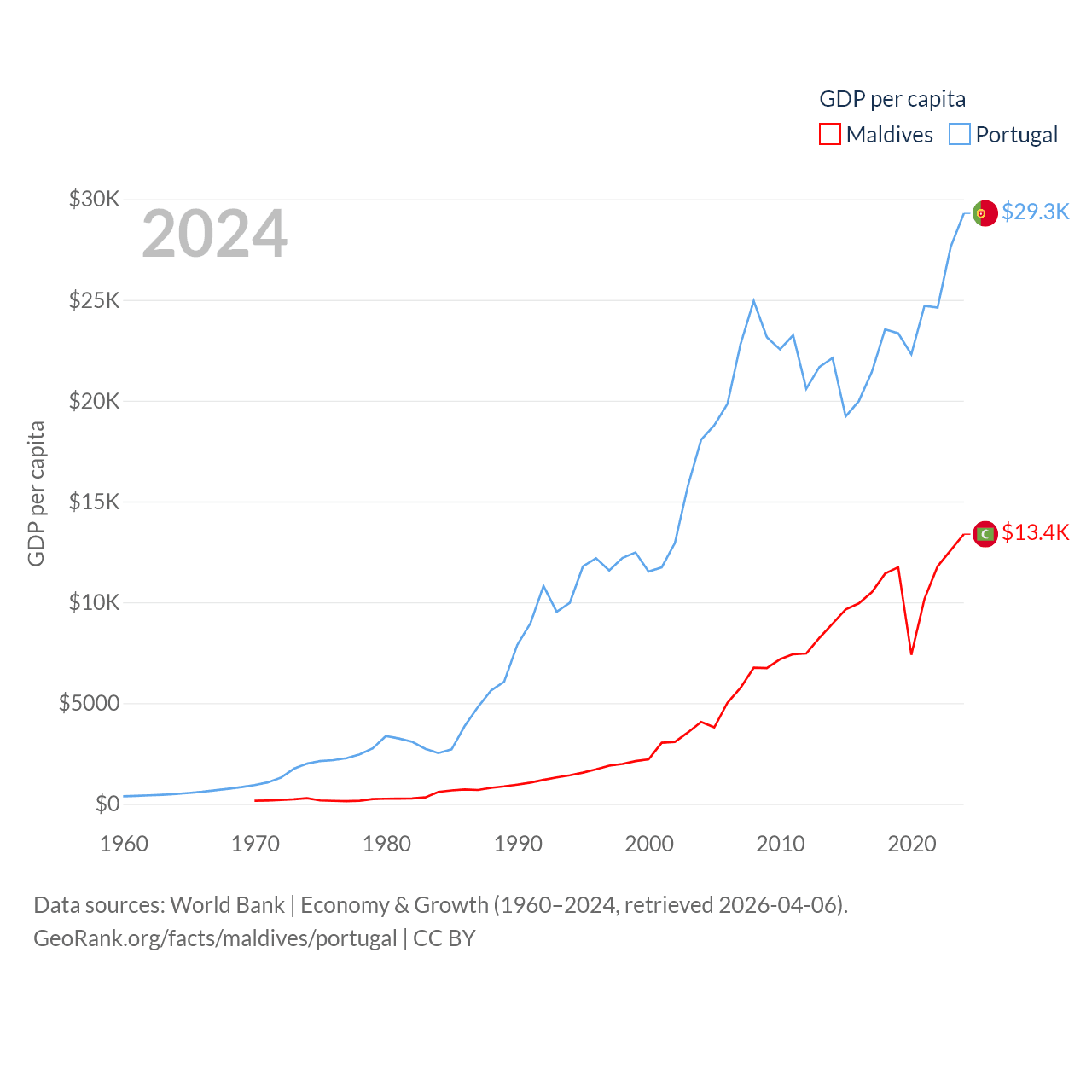 By GDP, Maldives ranks 159/197 ($7.06B) and Portugal ranks 46/197 ($313B). By GDP per capita, Maldives ranks 75/197 ($13,379), while Portugal ranks 44/197 ($29,292).