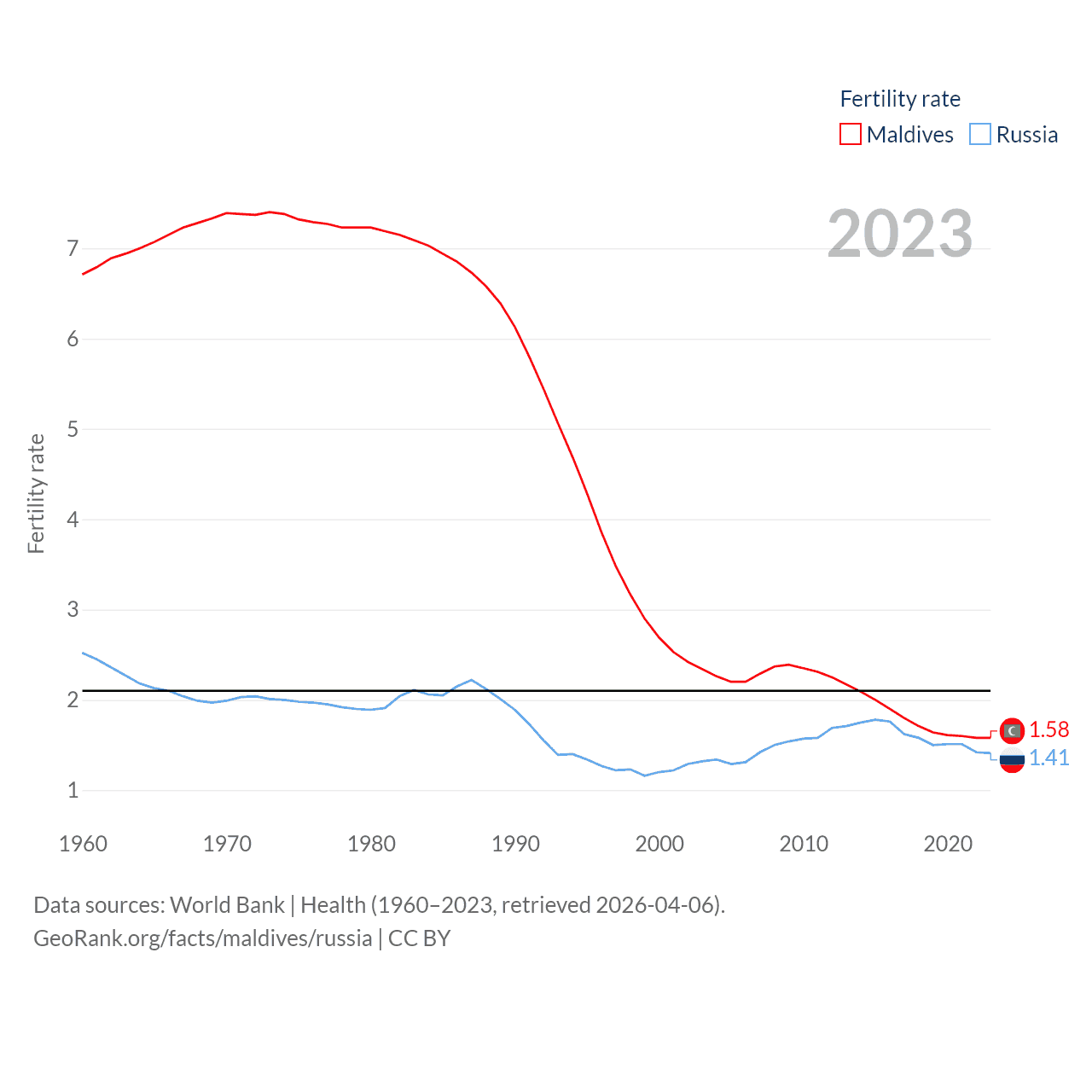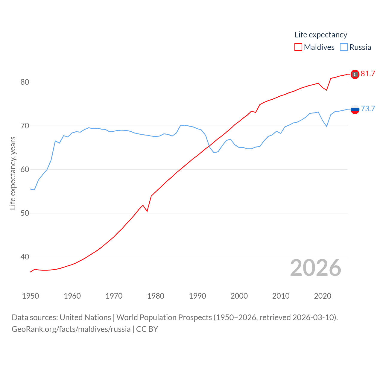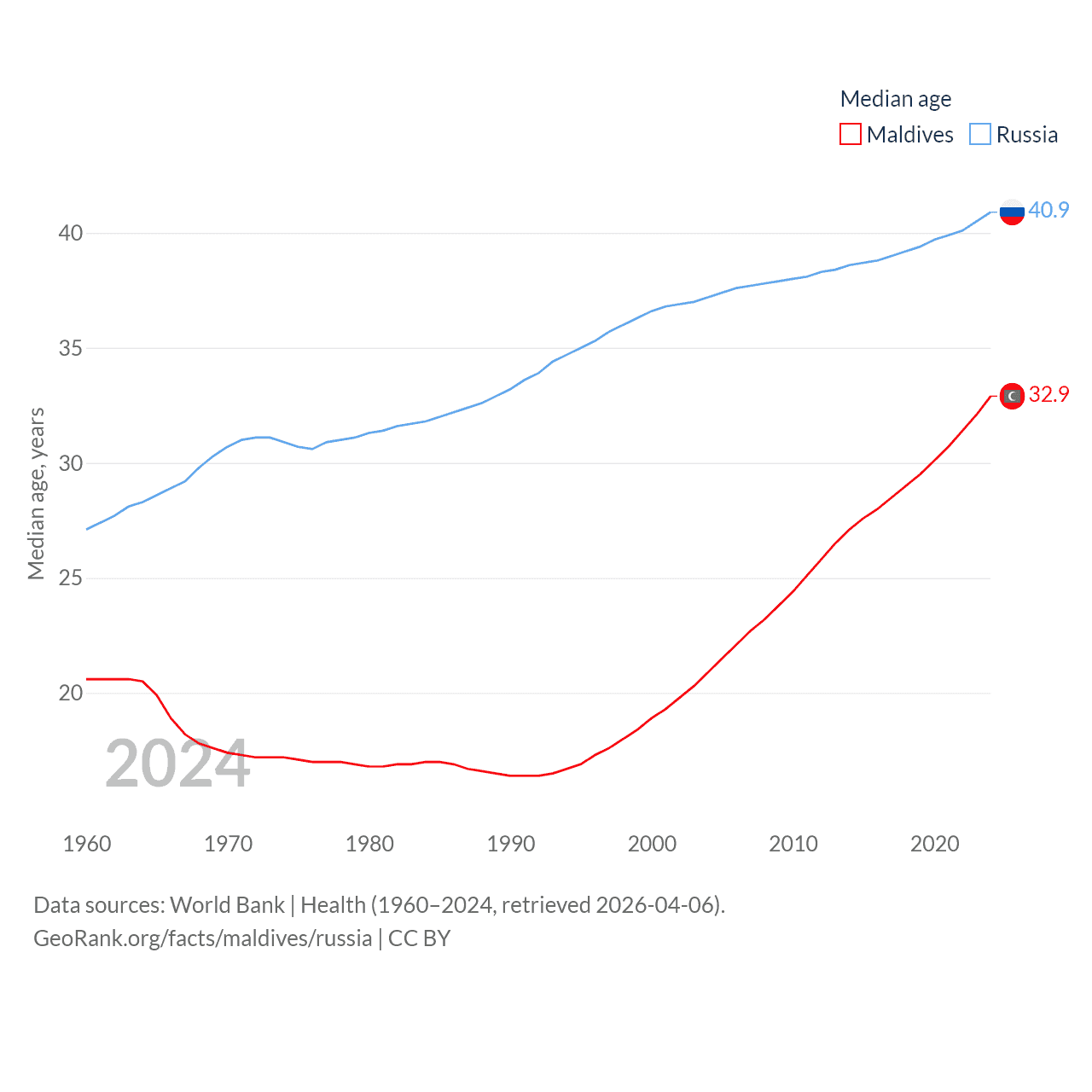 Maldives has a population of 528K (ranked 168/197), compared with 144M in Russia (ranked 9/197). Maldives' land area is 115.1 sq mi versus 6,323,145 sq mi for Russia (ranked 188th vs. 1st).